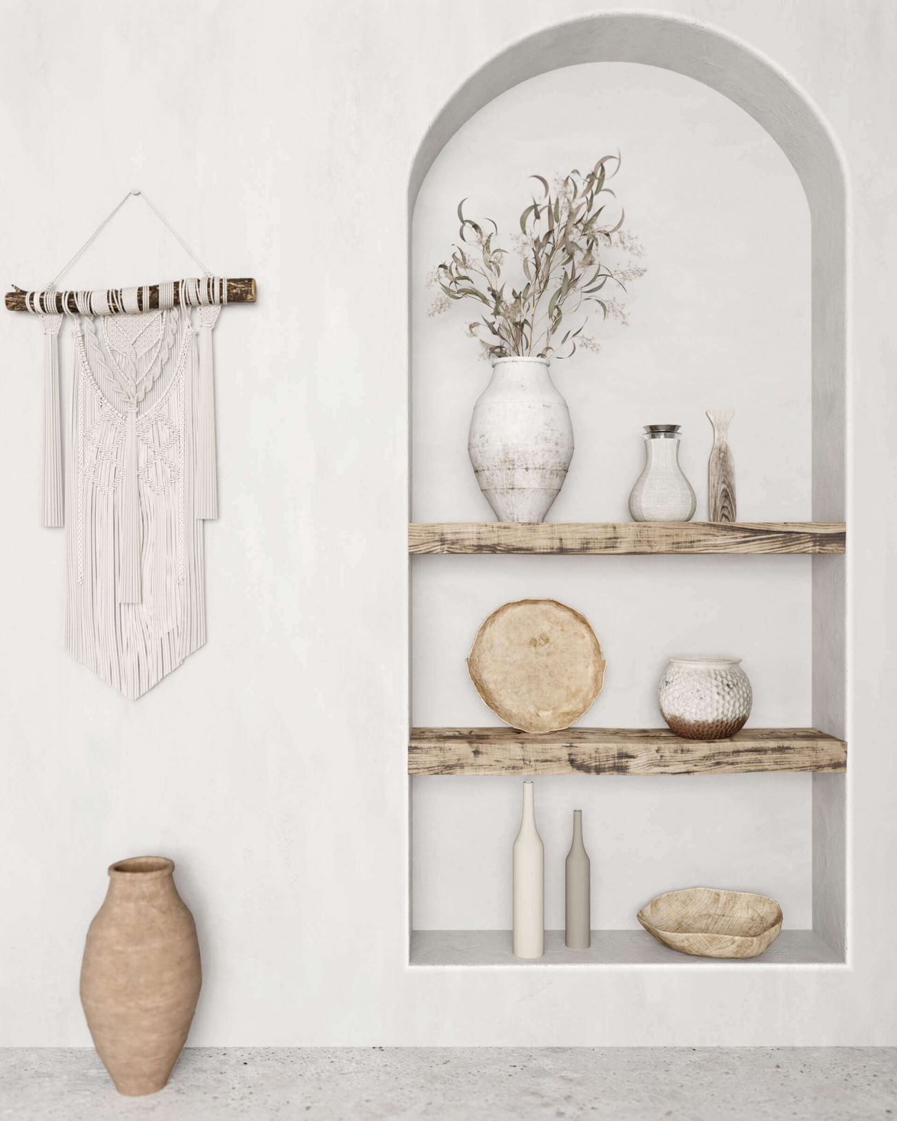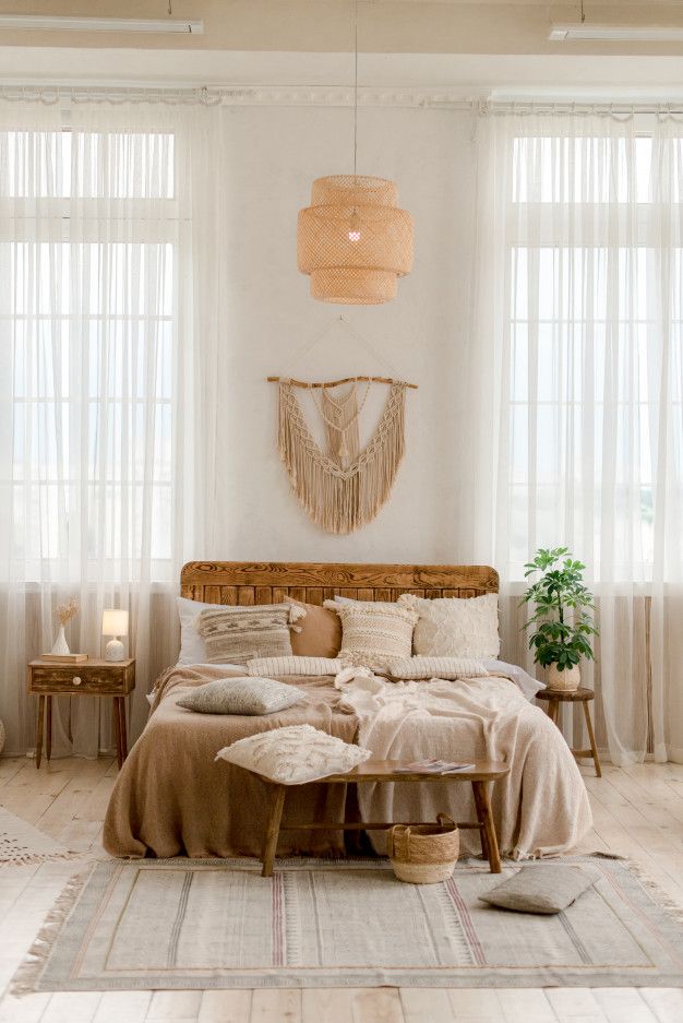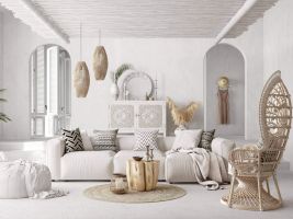 Ikonické jsou nízké stolečky ze dřeva. Stejně tak vzorované koberce, které můžete pověsit i na stěnu. Kromě toho udělají velkou parádu i závěsné dekorace. Nábytek by měl být s etno prvky s vyřezávanými motivy. Pohovky by měly pokrývat husté deky a přehozy. Originálním prvkem v interiéru by se mohl stát mech. Originální jsou například mechové obrazy. V každém boho interiéru pak nesmějí chybět pletené koše, které lze využít i jako obaly na květiny. Dominantou pokoje a zároveň útulným místem se pak může stát závěsné křeslo.