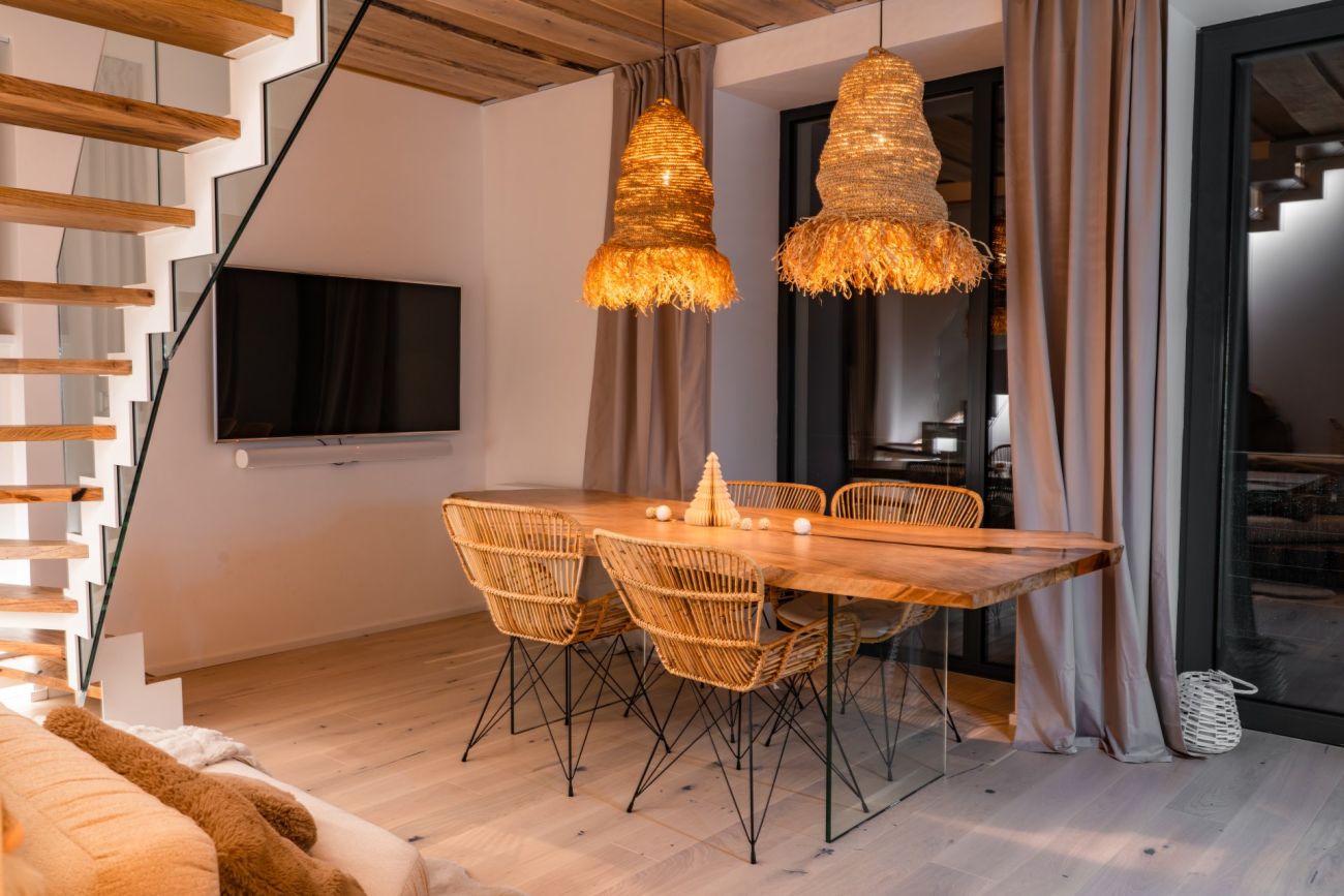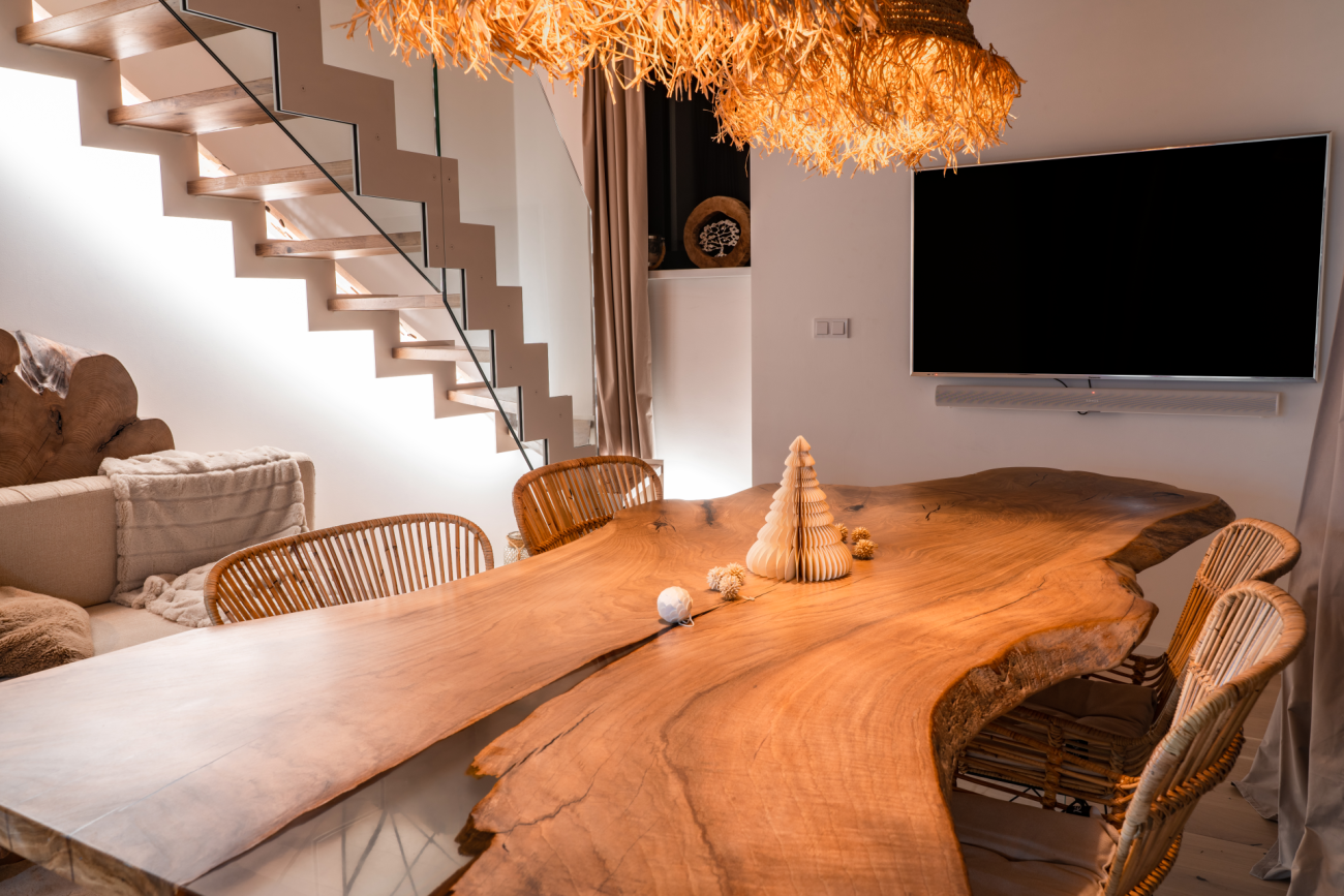 V interiéru krkonošského Yasmin apartmánu ale lze najít i další zajímavý nábytek dělaný na míru ze dřeva starých stromů. Je to například velký rodinný stůl z dubu, který se stal ikonou obývacího pokoje, unikátní dřevěné schodiště dolité čirým epoxidem či strop ze skládaných prken, který připomíná staré roubenky. Nejen tento nábytek, ale i další prvky doladily apartmán k naprosté dokonalosti. Přesvědčit se můžete v našem pořadu Stavba není sen 6, který mapuje vznik tohoto apartmánu od hrubé stavby až po jedinečně zařízený interiér.