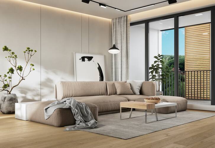 Vzdušné byty mají ve standardu velkoformátová hliníková okna se stylovými předokenními lamelami, dřevěné podlahy, interiérové i vstupní dveře s nadstandardní výškou 210 cm, dlažby ve formátech 60 x 60 cm v přírodních odstínech a samozřejmě nechybí značková sanita.