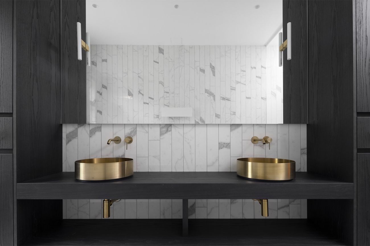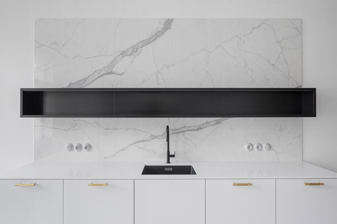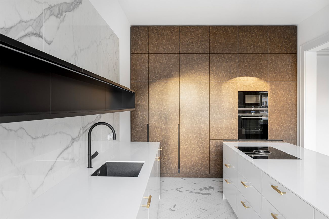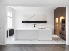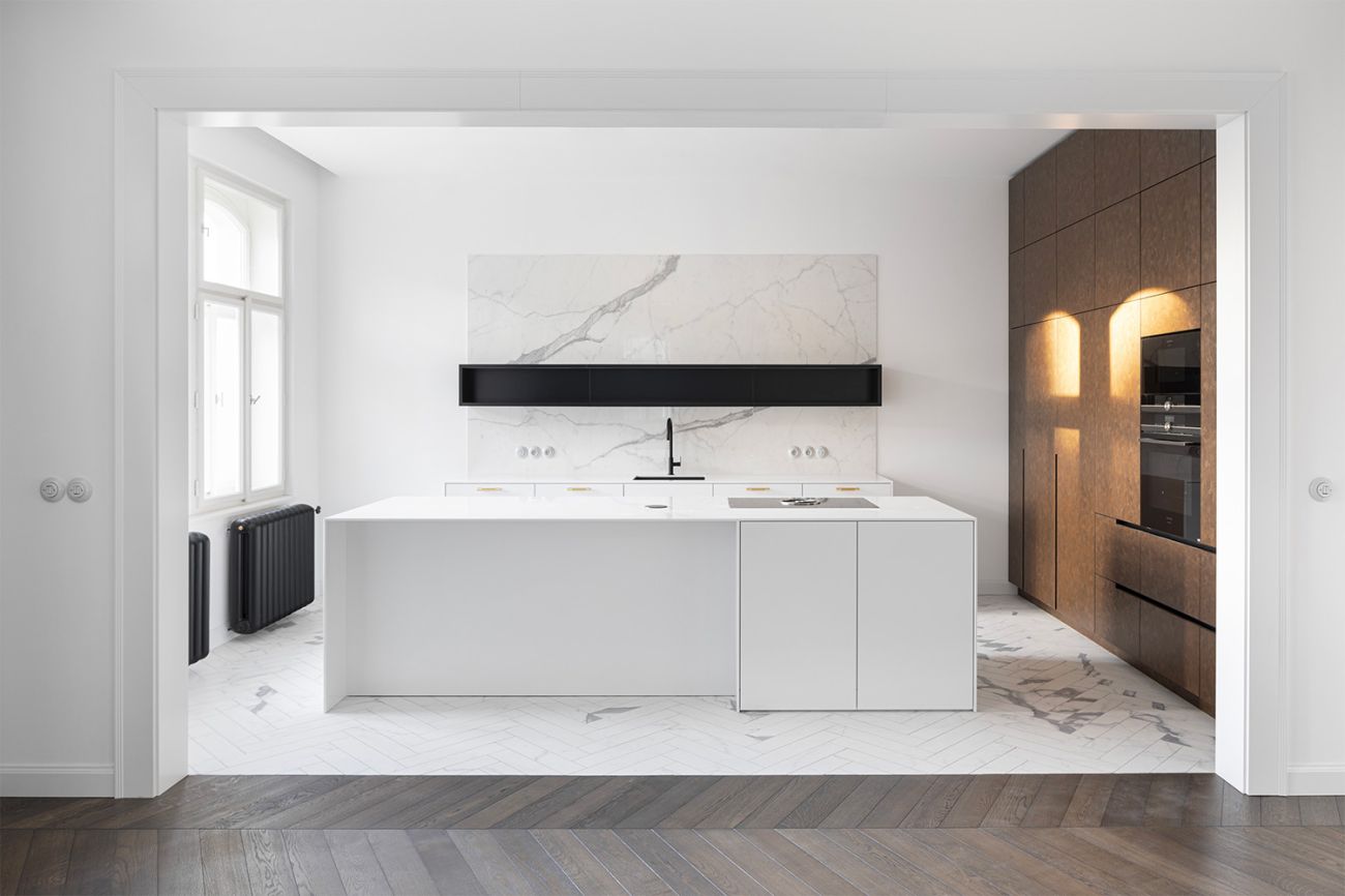 Také proto usilovali architekti o co nejvíce možné zachování původní atmosféry interiéru. Byt doplňují například repliky dveří z přelomu 19. a 20. století či další zajímavé historizující detaily. „Jedná se o moderní byt s prvky, které evokují dobovou atmosféru interiéru na Vinohradech. Například kuchyně je supermoderní s dobovými detaily, jsou zde dřevěné parkety, které jsme doplnili keramickou dlažbou v imitaci mramoru. Ta je řezaná na velikost parket a naskládaná do stromečku, aby kopírovala původní podlahu,“ doplňuje Hana Davidová.