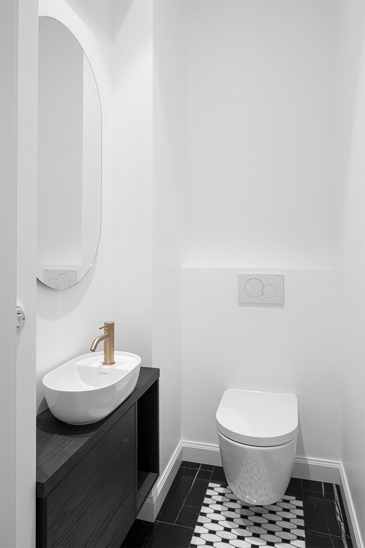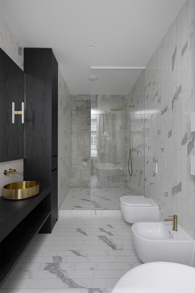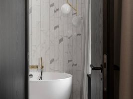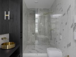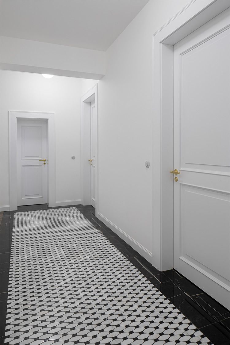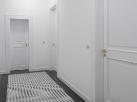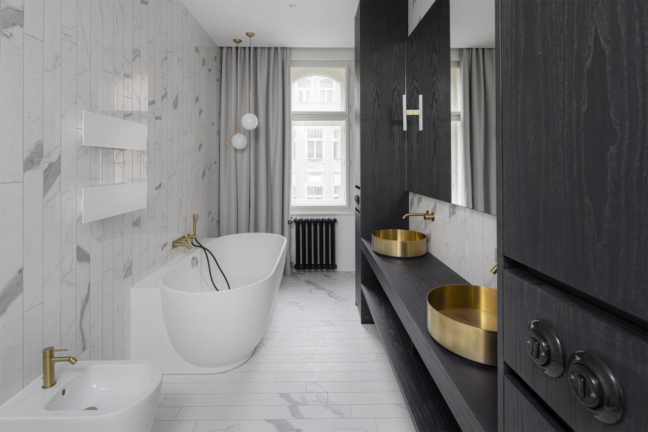 Byt nabízí velké množství úložných míst, která jsou schovaná do vestavných skříní. Najdeme zde i zajímavé detaily, jako jsou černé litinové radiátory, dobové keramické vypínače, matné černé baterie, zlatá umyvadla či stylové osvětlení. V chodbě pak zaujme replika dobových dveří a mramorová mozaika.
