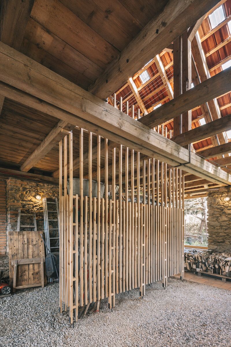 Přízemí stodoly je unikátní tím, že má tři pole vrat na obou stranách domu a lze ho tak celé otevřít. Prostor definují tři zóny - vstupní, pobytová a skladovací, které jsou od sebe odděleny pomocí zástěn.