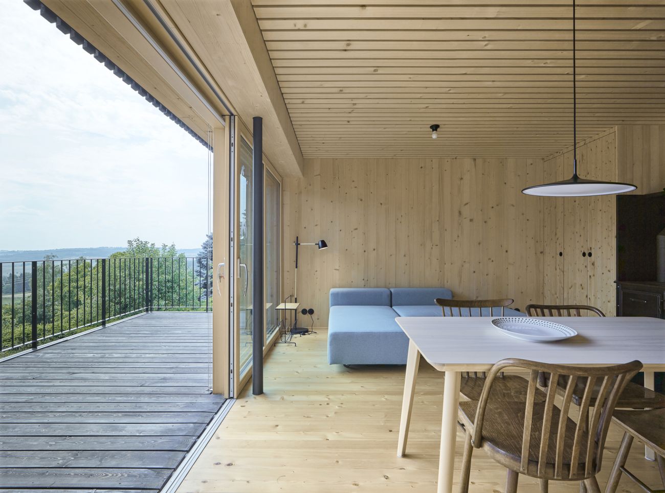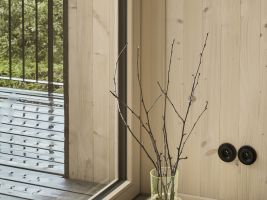 Velmi zajímavě je řešen interiér, jemuž dominují velká prosklená okna a smrkové obložení. Okna jsou posuvná, tudíž v létě se dá interiér hravě propojit se zahradou. Smrkové palubky zase vytvářejí pravou chatařskou atmosféru.