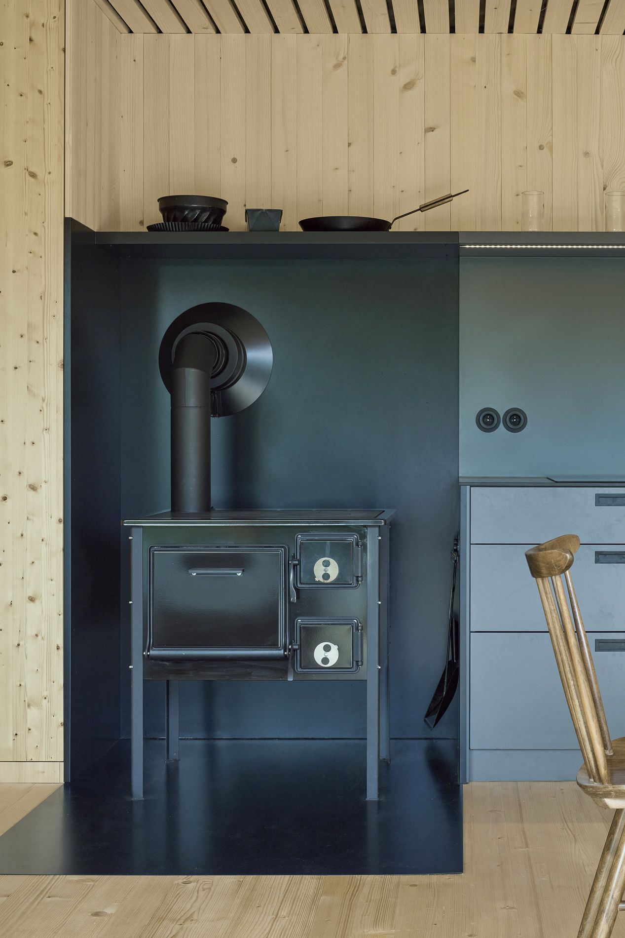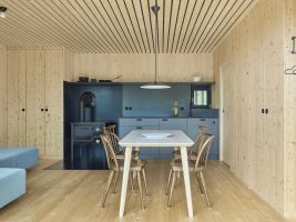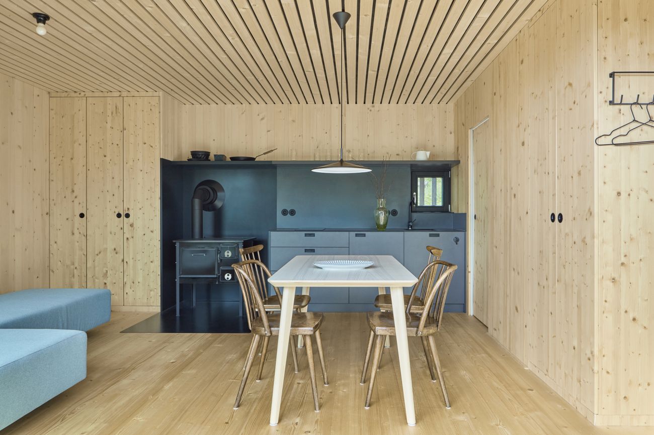 Přízemí poskytuje centrální obytný prostor pro vaření, stolování i odpočinek. Najdeme zde také WC se sprchovým koutem a technickým zázemím pod schody do patra. Na kuchyňskou linku navazují kamna, která slouží nejen k vaření, ale může se v nich i za chladnějších dní topit. Patro pak slouží především spánku a uložení osobních předmětů.