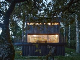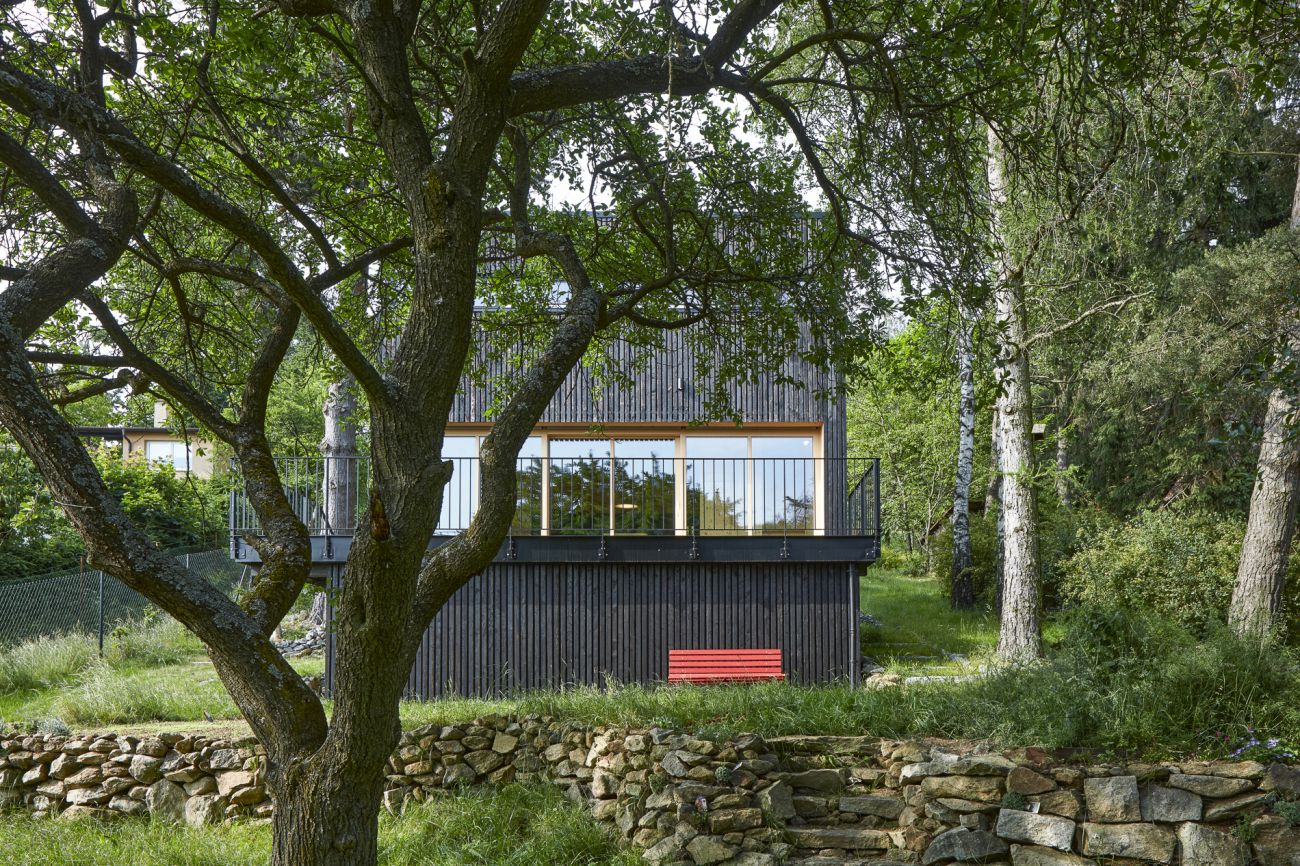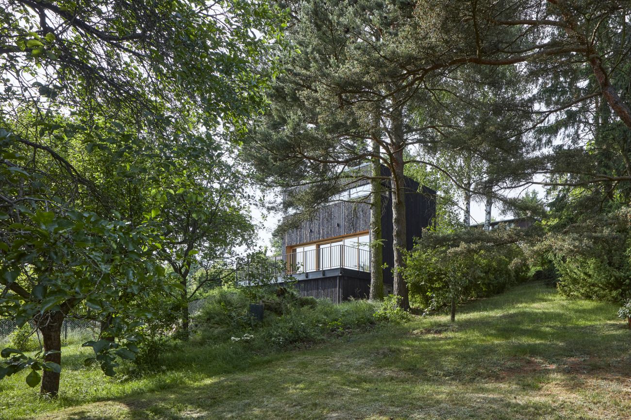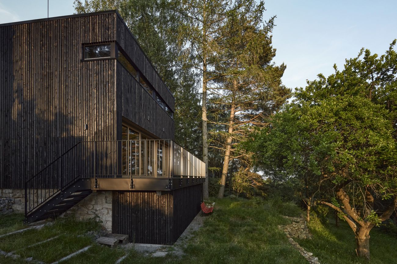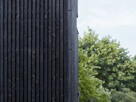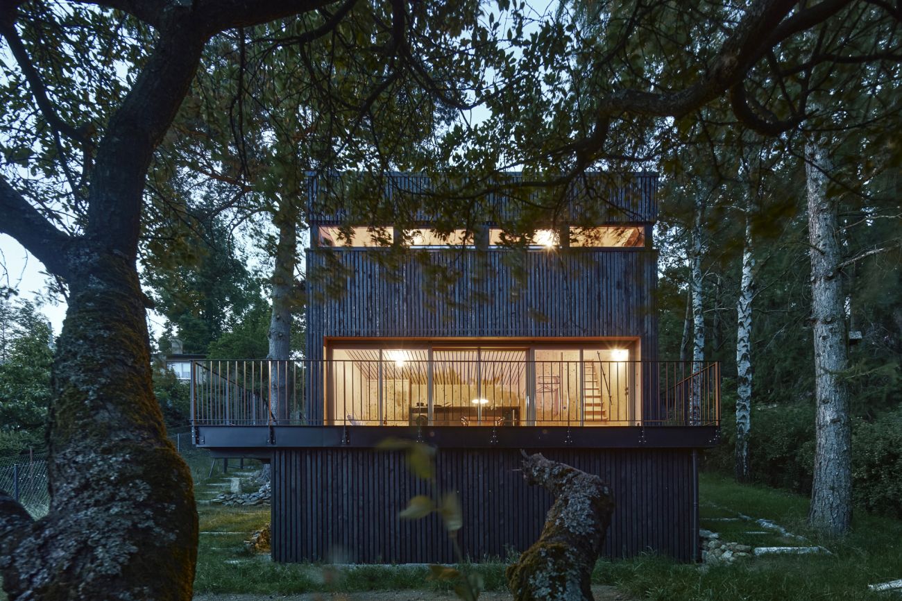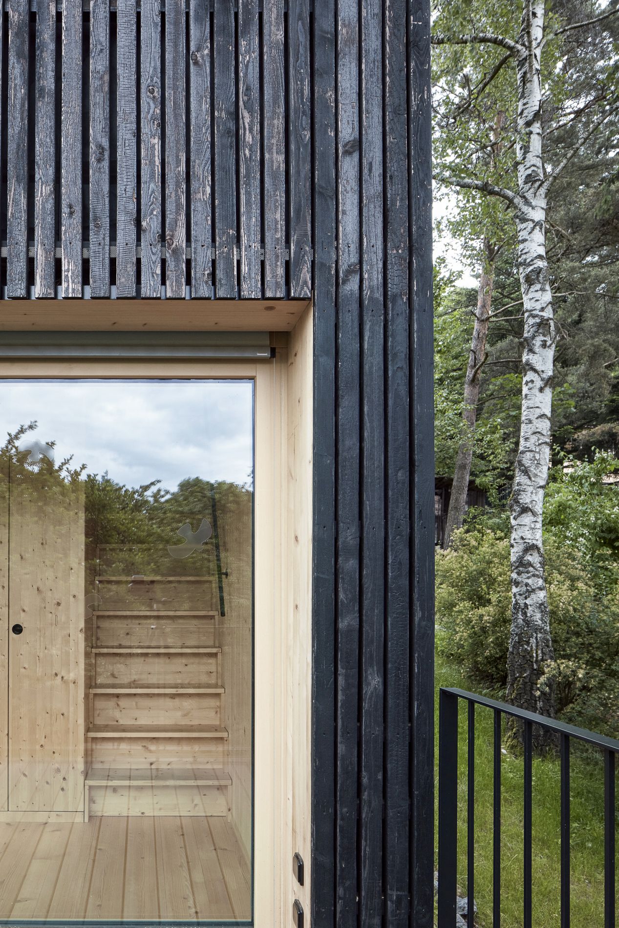 „Při zpracování menších domů, není důležité kolik m2 prostoru se řeší, ale jak je prostor definován a využit. Pro návrh jsou charakteristické kontrasty a dialogy. Jednak mezi zahradou a domem, ale také mezi exteriérem a interiérem. Chata v některých momentech tvoří výrazný kubus, jindy zase díky černé fasádě maximálně splývá s přírodu. Díky laťování z opáleného dřeva se povrch domu mění pod úhlem dopadajícího světla a jeho členitost může evokovat kůru stromů z okolí místa, kde dům stojí,“ uvádějí architekti.