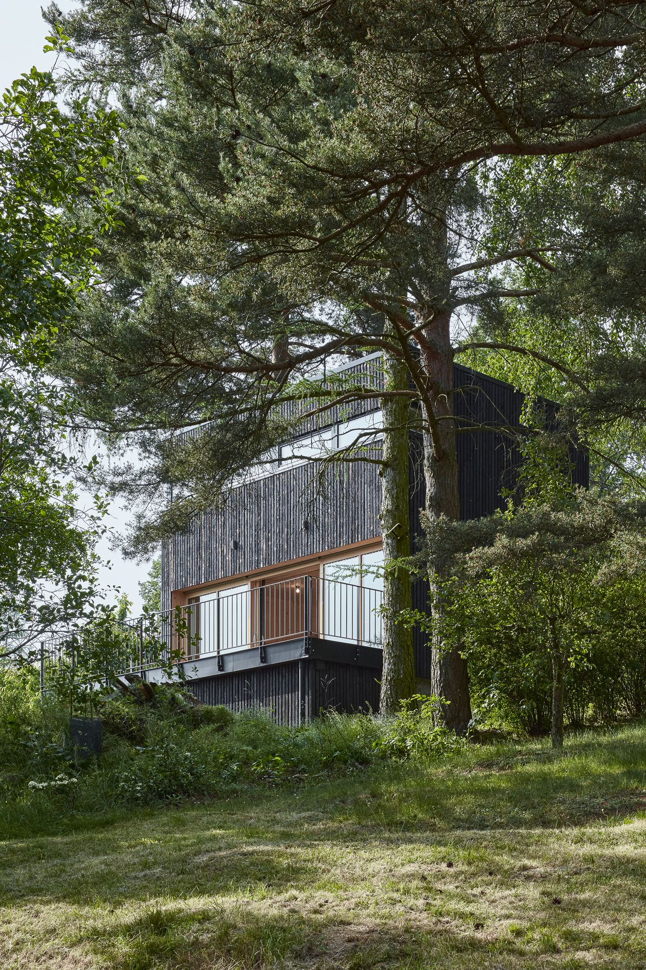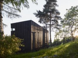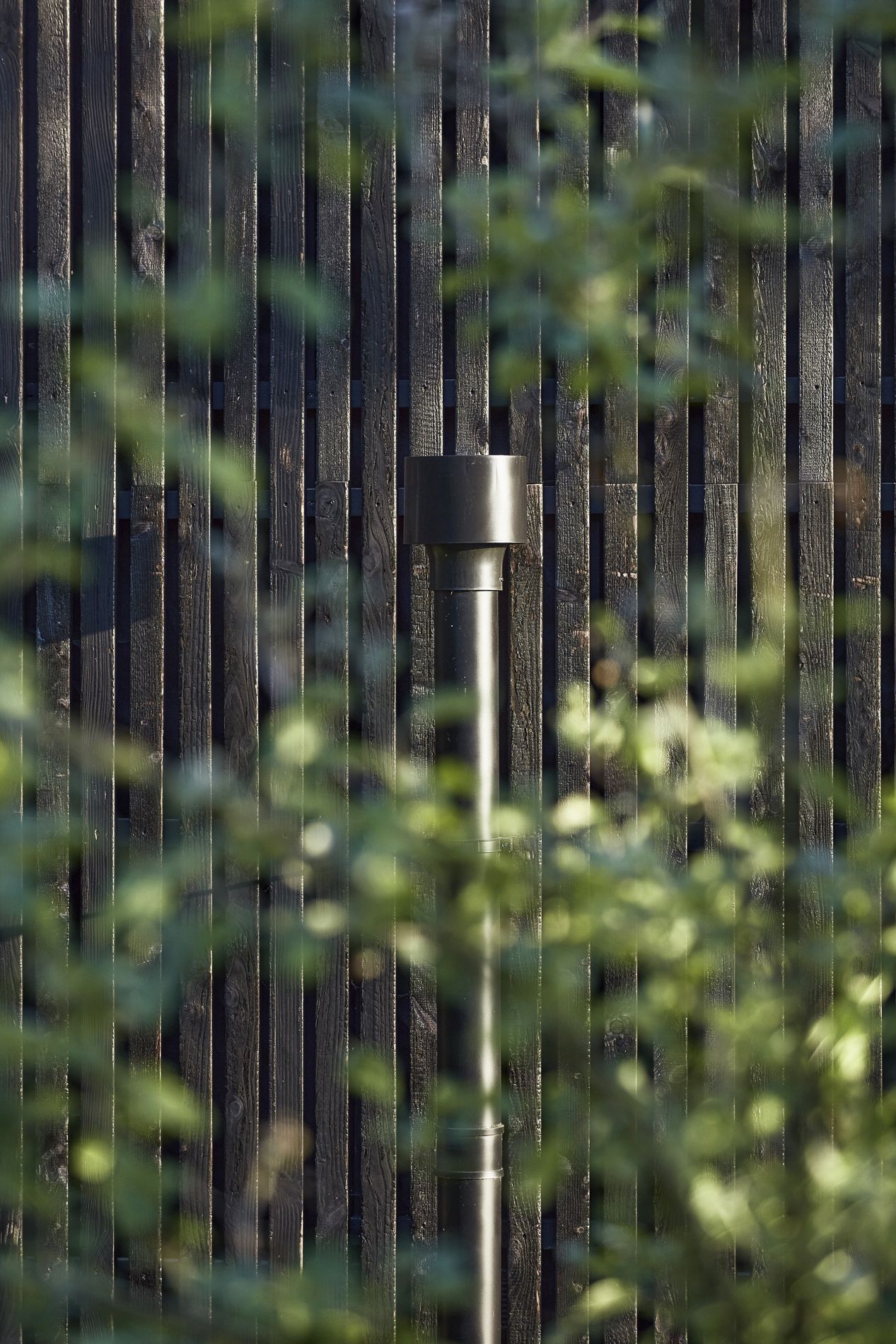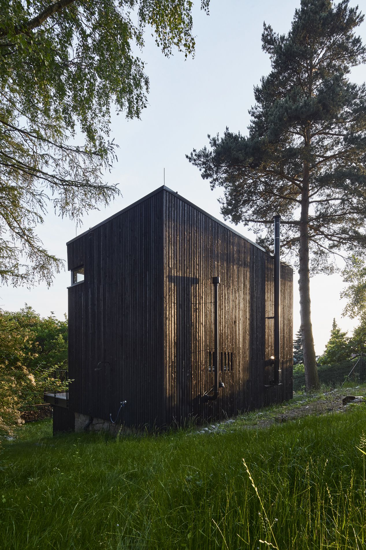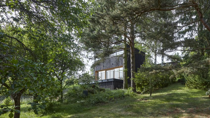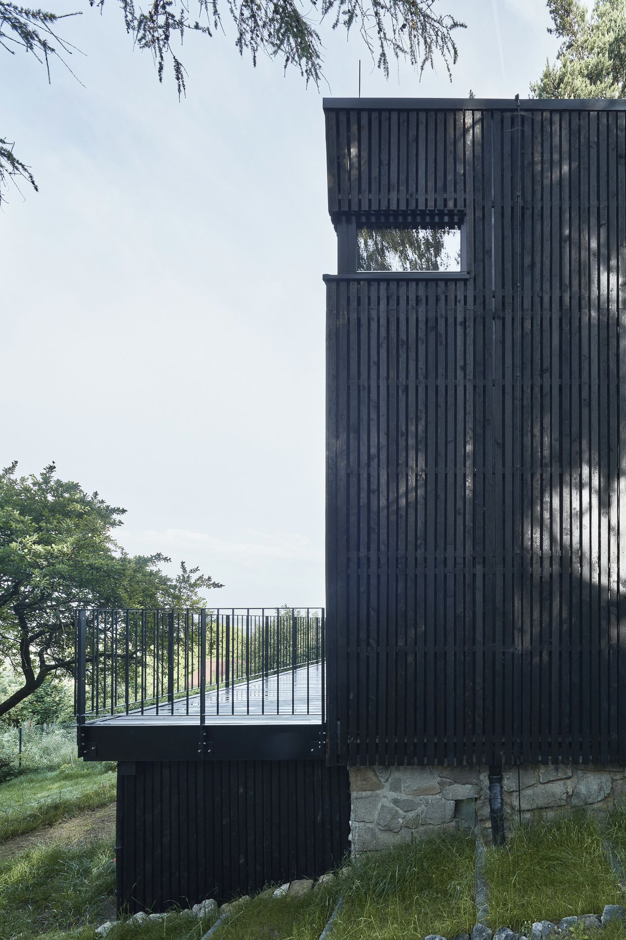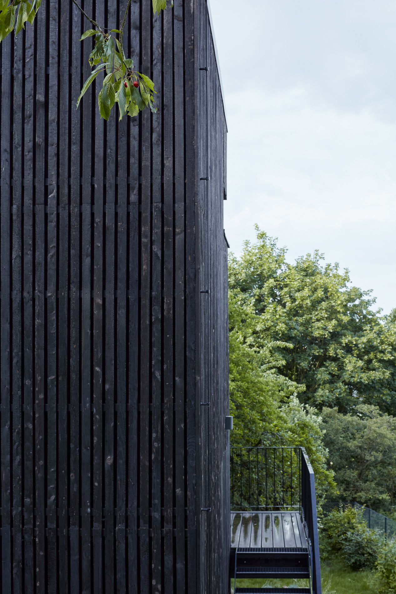 „Při zpracování menších domů, není důležité kolik m2 prostoru se řeší, ale jak je prostor definován a využit. Pro návrh jsou charakteristické kontrasty a dialogy. Jednak mezi zahradou a domem, ale také mezi exteriérem a interiérem. Chata v některých momentech tvoří výrazný kubus, jindy zase díky černé fasádě maximálně splývá s přírodu. Díky laťování z opáleného dřeva se povrch domu mění pod úhlem dopadajícího světla a jeho členitost může evokovat kůru stromů z okolí místa, kde dům stojí,“ uvádějí architekti.
