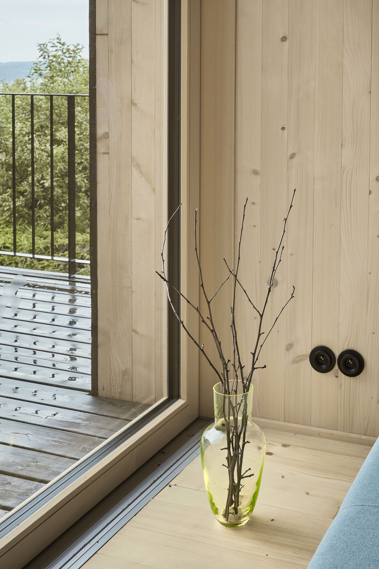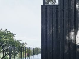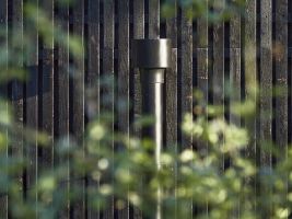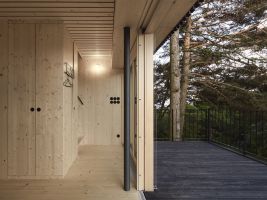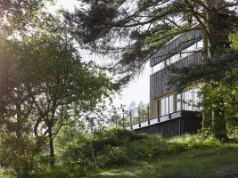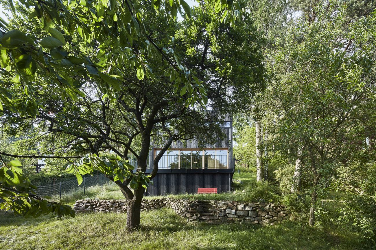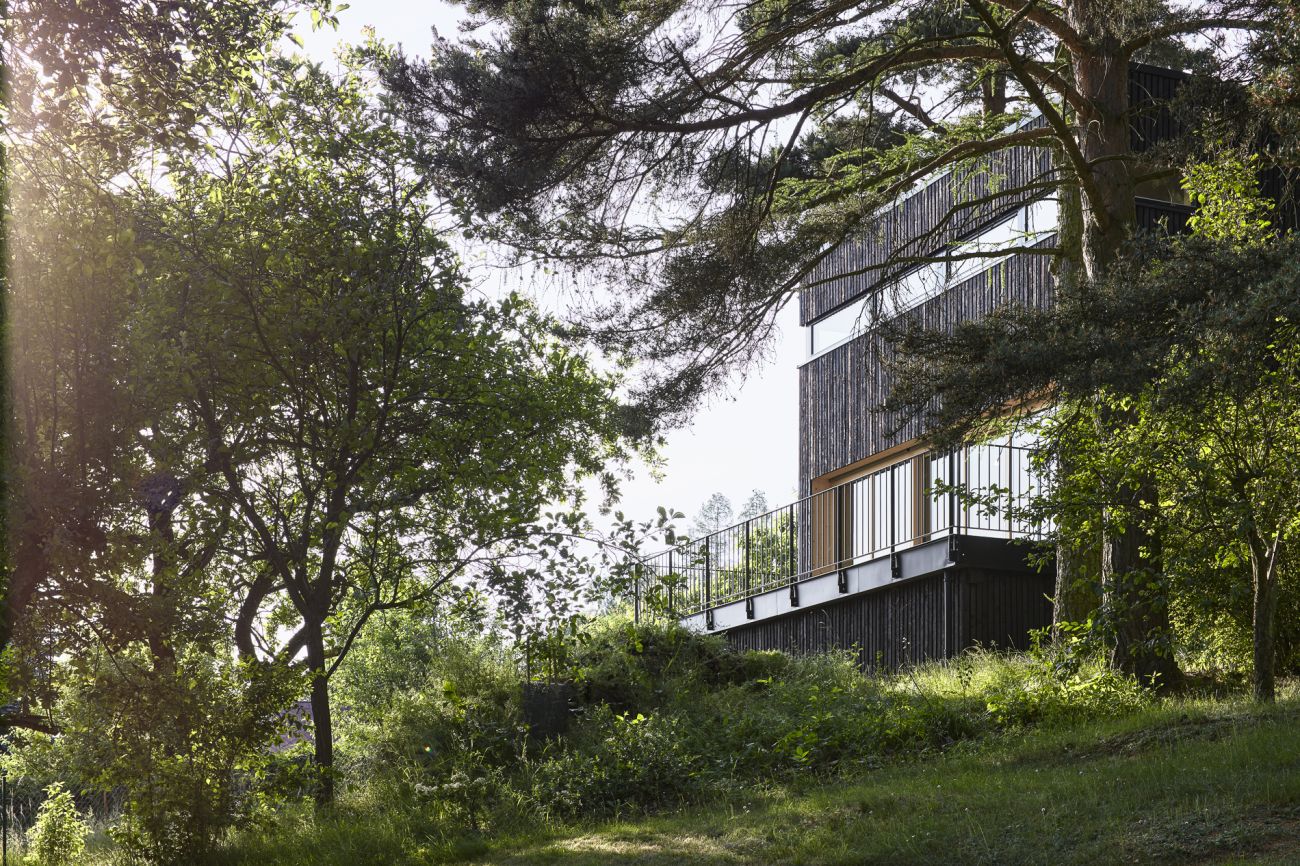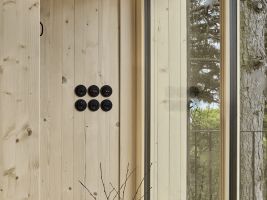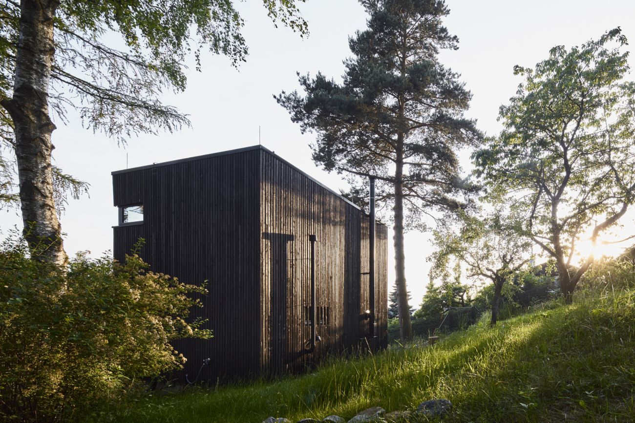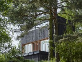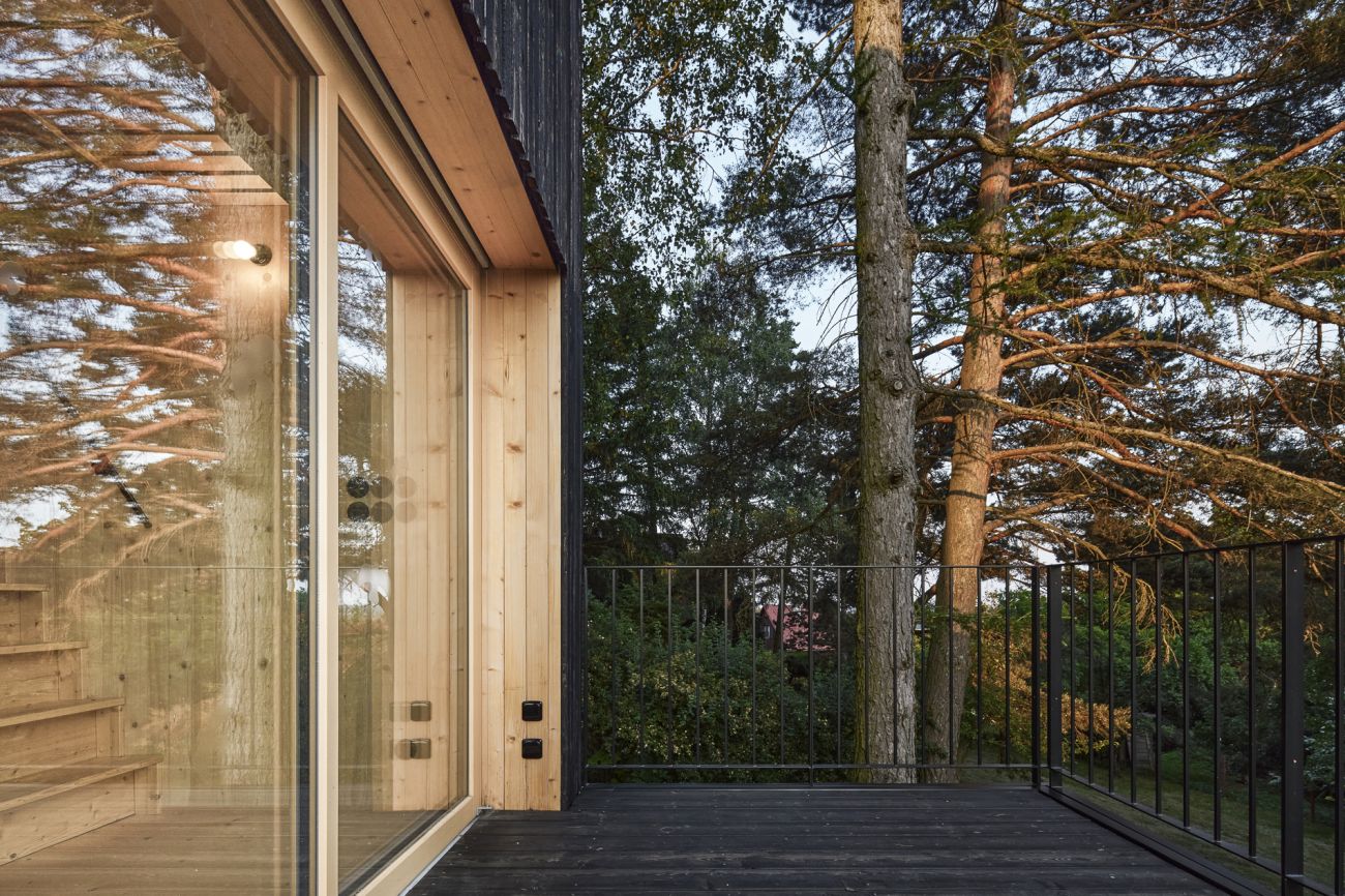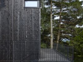 „Při zpracování menších domů, není důležité kolik m2 prostoru se řeší, ale jak je prostor definován a využit. Pro návrh jsou charakteristické kontrasty a dialogy. Jednak mezi zahradou a domem, ale také mezi exteriérem a interiérem. Chata v některých momentech tvoří výrazný kubus, jindy zase díky černé fasádě maximálně splývá s přírodu. Díky laťování z opáleného dřeva se povrch domu mění pod úhlem dopadajícího světla a jeho členitost může evokovat kůru stromů z okolí místa, kde dům stojí,“ uvádějí architekti.