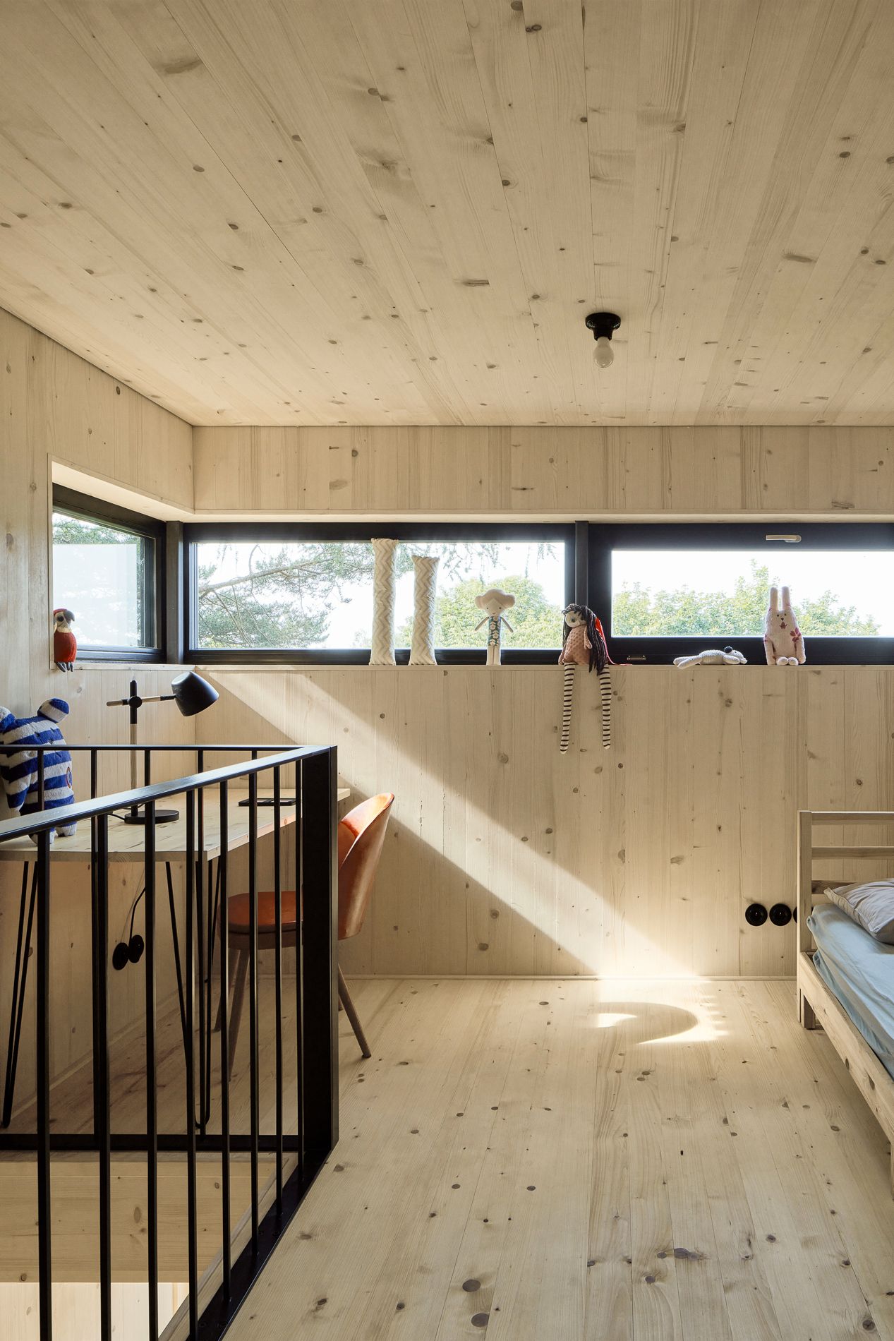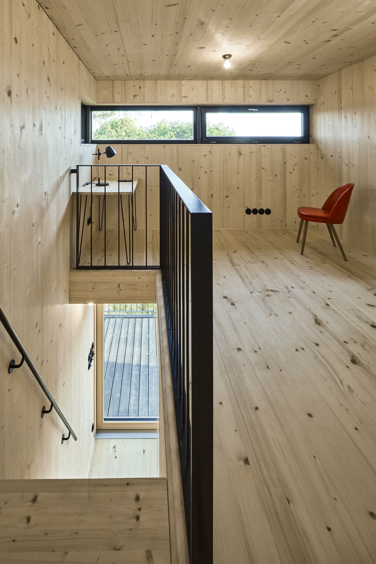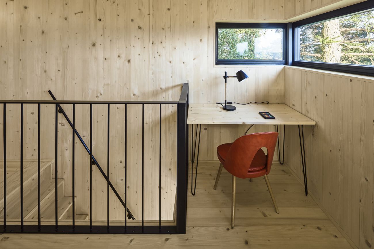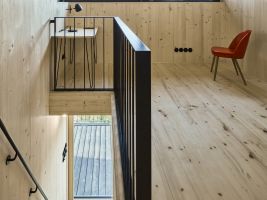„Bylo dbáno na každý detail provedení. Z dřevěného interiéru vystupují černé technické prvky zpracované zámečnicky. Hra s rastrem a členěním na stropě v přízemí příjemně formuje prostor,“ dodávají architekti.