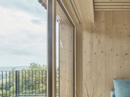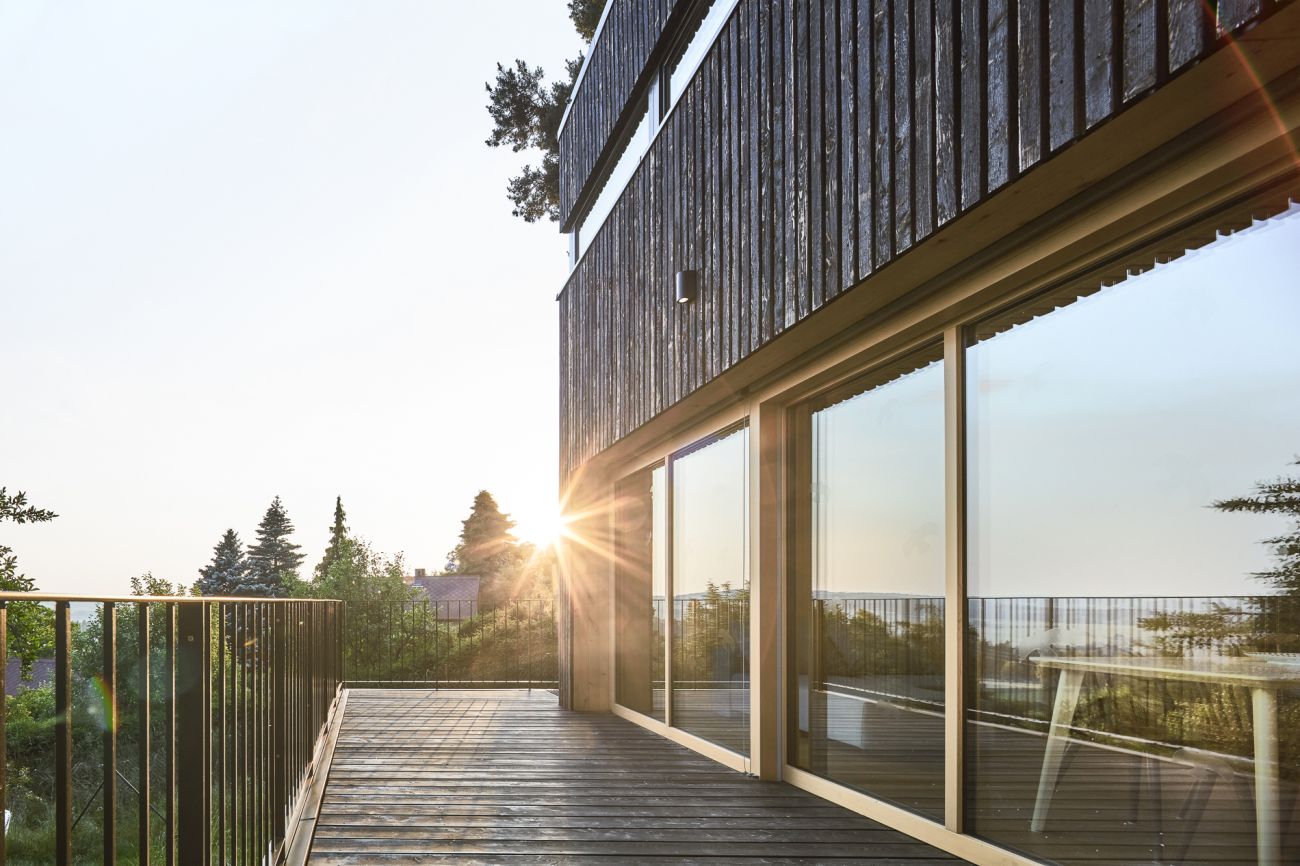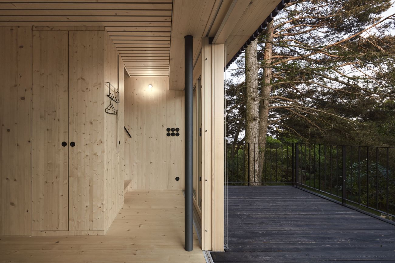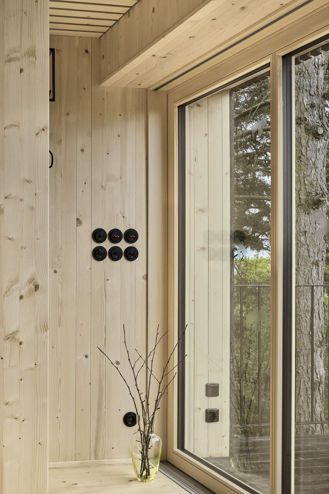 „Bylo dbáno na každý detail provedení. Z dřevěného interiéru vystupují černé technické prvky zpracované zámečnicky. Hra s rastrem a členěním na stropě v přízemí příjemně formuje prostor,“ dodávají architekti.