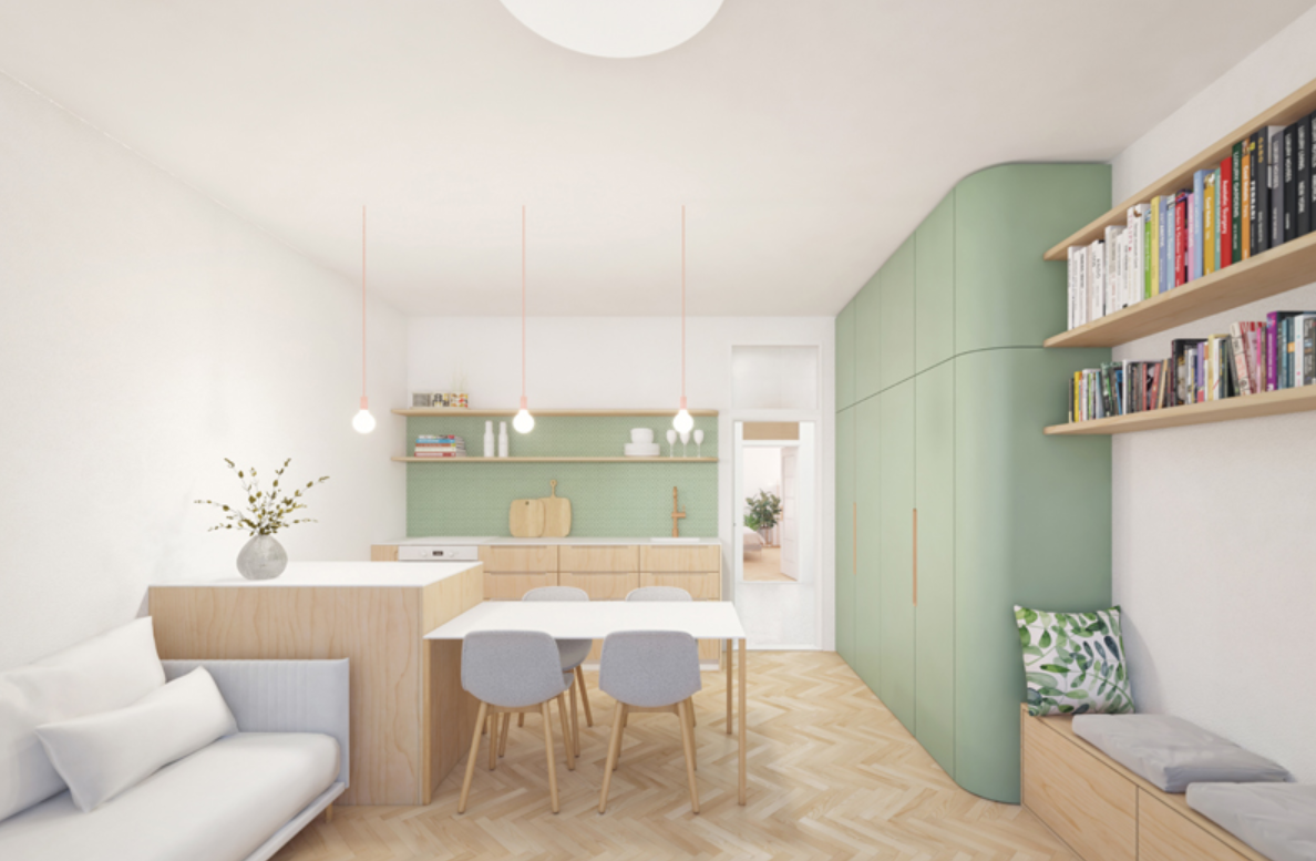 Mátovou barvu můžeme zařadit mezi trendy pastelové barvy v interiéru. Hodí se na stěny, doplňky i třeba solitérní kousky nábytku. Výhodou této barvy je, že se dá skvěle kombinovat, je nadčasová, rozjasní prostor, a navíc má prý uklidňující účinky. Inspirovat se můžete například v originálním interiéru od architektů z 0,5 studio.
