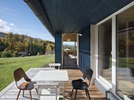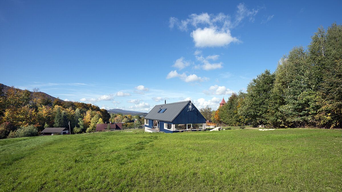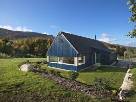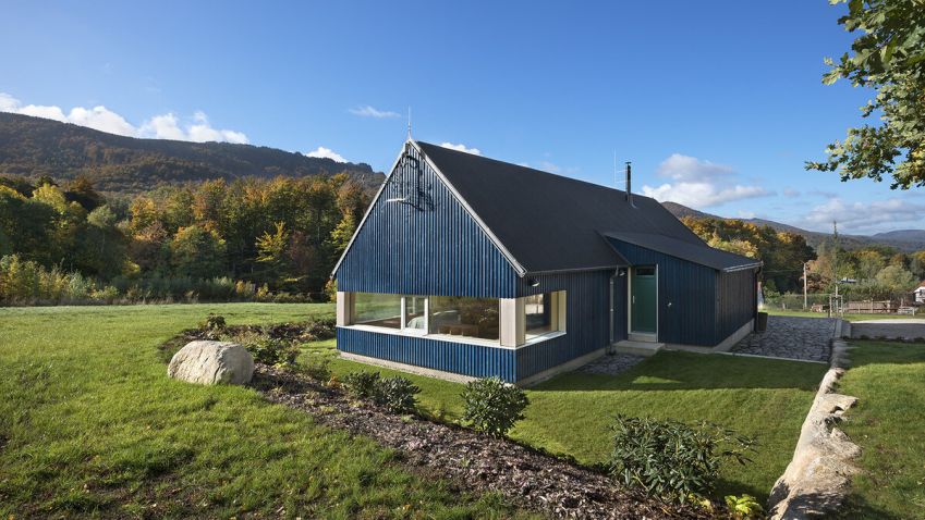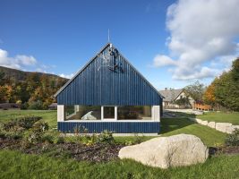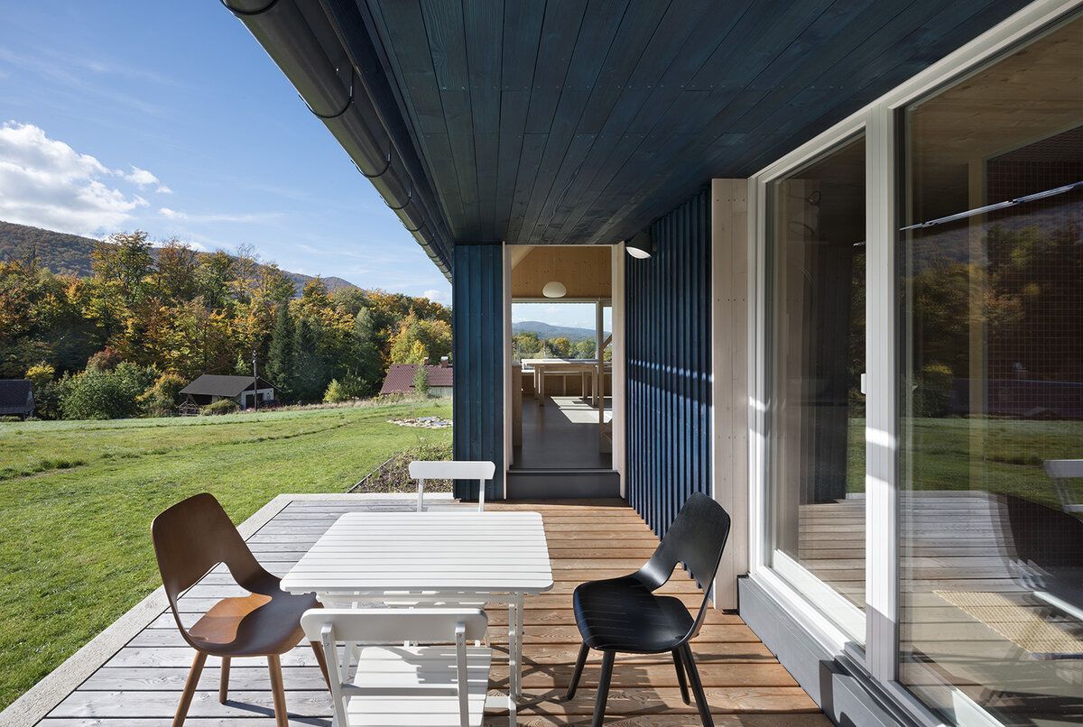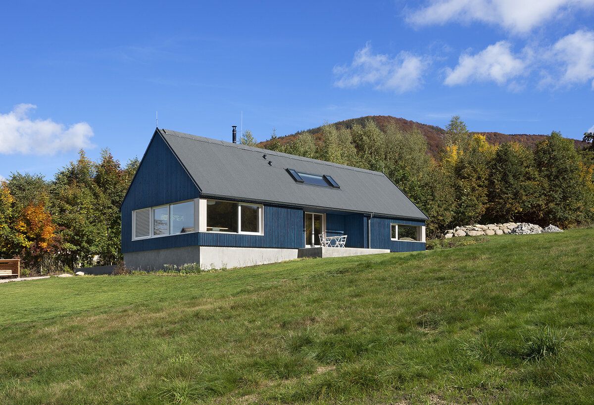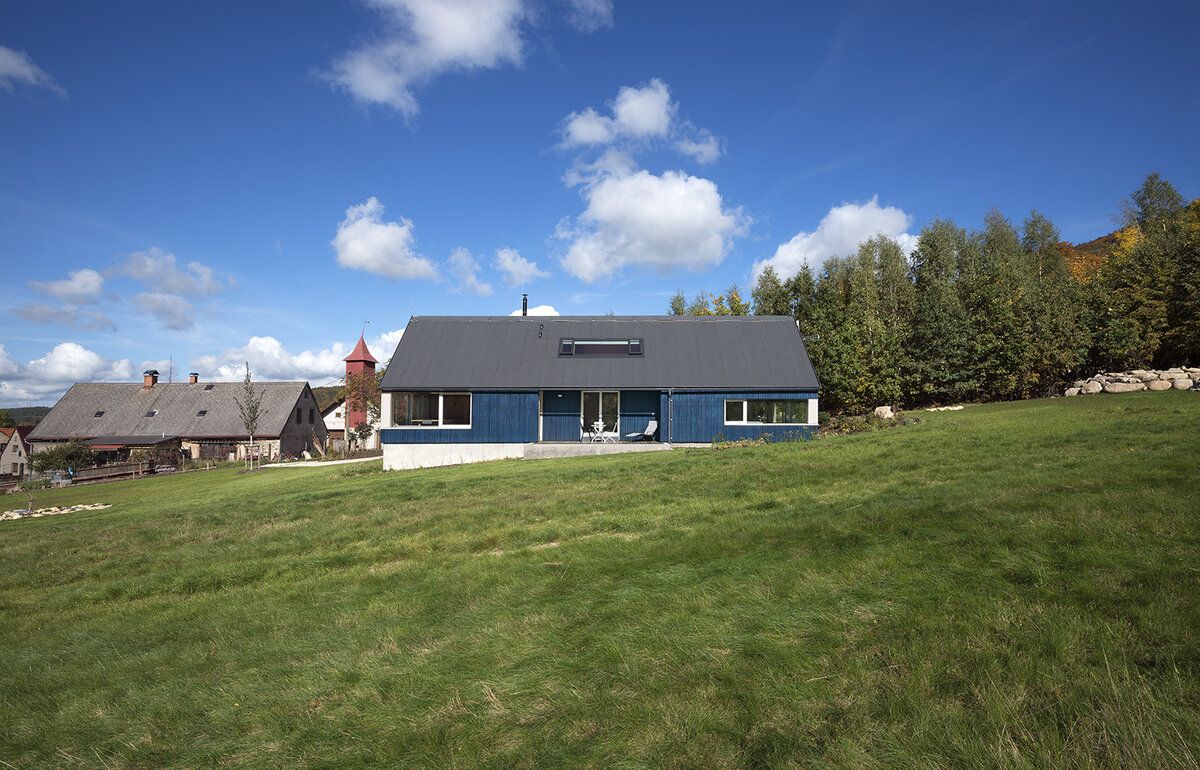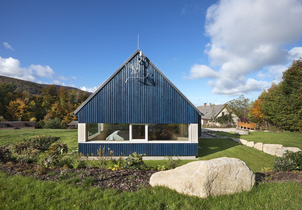 Chata od architektonického studia Markéty Cajthamlové už z dálky zaujme svou tmavě modrou fasádou. Budova ze dřeva a kamene, tedy typických lokálních materiálů, dostala tradiční formu, která navazuje na zástavbu malé obce v Jizerských horách.