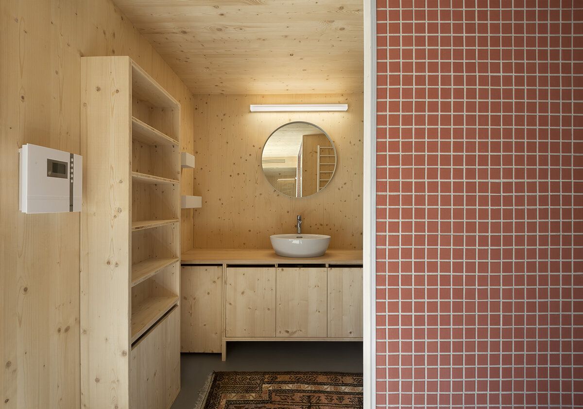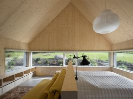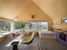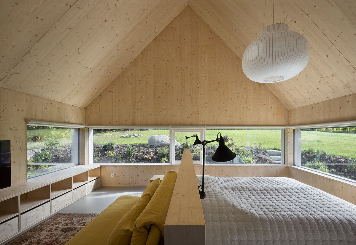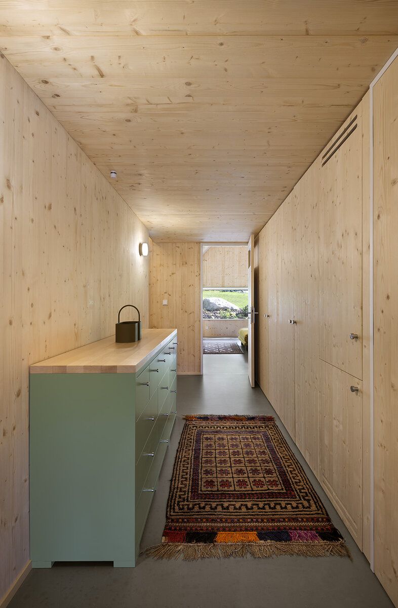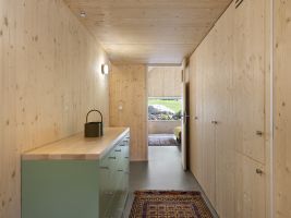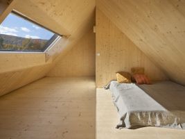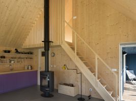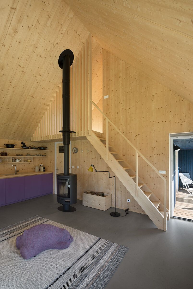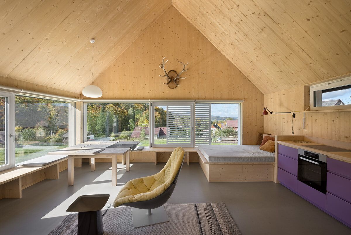 Dispozice je rozdělena na tři části. Obytný prostor s kuchyní a jídelnou orientovaný na západ, na východ směřující ložnice s možností noclehu až čtyř osob a střední část tvoří zázemí s koupelnami. Celý interiér je dřevěný včetně dělících příček. Podlaha je navržena z šedé cementové stěrky.