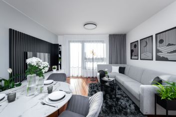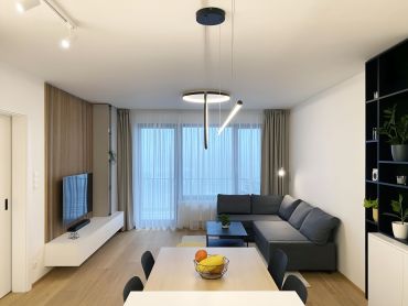 Byt v developerském projektu na okraji Prahy koupili klienti ve fázi, kdy již nebylo možné provádět žádné klientské změny. Dispozice hlavního obytného prostoru ale byla nevyhovující, proto byla navržena její úprava i za cenu zásahů do stávajících elektroinstalací. Srdcem celého prostoru, kolem kterého se odehrává hlavní dění a pohyb, je bílý blok kuchyňského ostrůvku a na něj navazující jídelní stůl. Jeho význam podtrhuje i designově výrazné závěsné svítidlo. Kuchyňská linka je pro co nejoptimálnější využití prostoru navržena do tvaru L se skříňkami vysokými po strop. Ve druhé části místnosti je minimalističtěji řešená televizní sestava, která vyvažuje maximálně využitou kuchyňskou část. Celým interiérem se propisují černé prvky v podobě detailů na nábytku.
