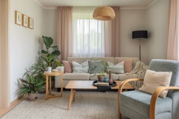 Klienti toužili po světlém obývacím prostoru, který bude sloužit k relaxaci a lenošení. Zároveň bylo potřeba propojit neosobní jídelní kout v kuchyni se zbylým prostorem. Využity byly přírodní materiály v kombinaci se světlými pastelovými barvami. Pokoji dominuje vyšší pohodlné křeslo, ve kterém odpočívá hlavně pán domu. Hlavním materiálem je světlé dřevo, kterému jsou v kontrastu odstíny zelené, modrozelené a růžové. Drobné doplňky a detaily úchytek jsou v černé barvě. Příjemnou atmosféru dotváří všudypřítomné květiny a grafiky na stěnách, které dostaly nové rámy a pasparty.