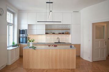 Historický dům je jedna z významných staveb židovského ghetta v královském městě Rakovník, ležícím uprostřed křivoklátských lesů. Zadání bylo zachovat ducha domu a zároveň vytvořit kuchyň, co má šmrnc. Navrženy byly odlehčené asymetricky zavěšené horní skříňky s policemi, které sdílí zaoblené prvky a zároveň chytře slouží k osvětlení pracovní desky. Nika za dřezem je původní a ponechává tak nové kuchyni odkaz minulosti. Pracovní deska z masivního dubu s originální strukturou působí klasicky, přirozeně a příjemně kontrastuje s tlumeným neutrálním lakem nábytku. Nedostatek úložného místa v kuchyni řeší vysoká zaoblená skříň s vloženou knihovnou.