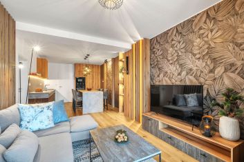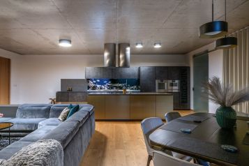 Horský apartmán se nachází v krásném prostředí Krkonoš na Benecku. Koncept bytu je navržen v souladu s přírodou. Jsou zde přírodní materiály, moderní dekory v imitaci betonu, kovu a rezy. Díky tomu dostal interiér vyváženost a eleganci. Dominantní je prostorným ostrůvkem s kompaktní deskou pro kapacitu 6 míst, který má zároveň uprostřed skryté úložné prostory.