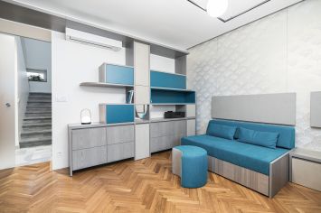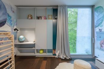 Návrh a realizace dvou dětských pokojů pro desetiletou dívku a sedmiletého chlapce v rodinném moderním domě v Modřanech. Majitelka si přála pokoj pro malou baletku a chlapecký pokoj zase s tapetou a nádechem modré. Výzvou byl opravdu malý prostor v pokojích cca 11m2. Bylo potřeba umístit postel, psací stůl, vestavěný úložný díl a spaní pro kamarády. Postele mají vysouvací šuplík pro příležitostné přespání. Poličky ve vestavěných skříních jsou osvětlené LED pásky pro dosažení příjemnějšího pocitu. Veškerý nábytek je navržen na míru.
