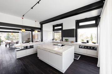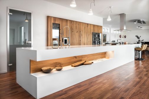 Investor si přál vytvořit otevřený kuchyňský prostor s výrazným ostrůvkem, který volně navazuje na obývací část nově navržené vily. Celkový koncept má evokovat vzdušnost a pobízet návštěvníky k neomezenému pohybu. Důraz byl kladen na neutrální tóny a využití vysoce kvalitních materiálů, podporujících estetiku prostoru. Kuchyňský nábytek splňuje náročné požadavky investora. Vysoké skříně jsou vyrobeny z unikátní dubové dýhy ze starých trámů. Ostrůvek o délce 7,5 metru je vyhotoven z jednoho kusu. Unikátní technologie umožnila použití bílého Corianu na všech plochách, a to včetně plochy čel výsuvných skříní. Kuchyně je vybavena prémiovými spotřebiči, které nejenže zajišťují optimální funkčnost, ale také dotvářejí luxusní estetiku celého prostoru. Vše doplňují kožené barové židle.