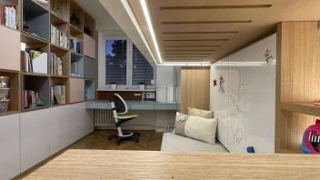 V patře rodinného domu vznikl zajímavý prostor se zkosenou boční stěnou a otevřenými výhledy na zelené terasy domu. Klienti chtěli tento prostor využít pro příležitostné přespání nejstaršího syna, který má zálibu v asijské kultuře. Pokoj je pojat s tradičním japonským minimalismem a jednoduchými liniemi, zároveň však moderně a mladistvě.