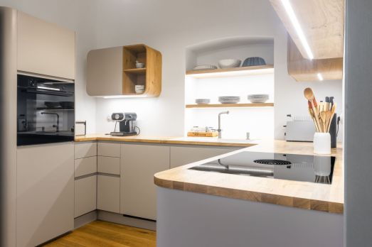 Investor si přál vytvořit moderní kuchyň, která s citlivostí doplní nedávno zrekonstruovaný byt ve vinohradském stylu. Dispozice byla pečlivě navržena s ohledem na průchozí prostor a maximální využití dostupné plochy. Barevnost materiálů kuchyně byla pečlivě vybrána s respektem k nově položené parketové podlaze. Pro kuchyňský nábytek byla zvolena kombinace světle šedého matného melaminu a mořené dubové dýhy.