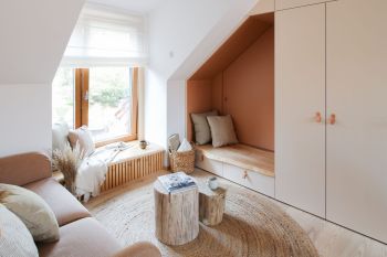 Paní majitelka měla v patře domu dva průchozí pokoje, které potřebovala lépe přizpůsobit potřebám svých hostů. Přála si plně funkční prostor pro svou rodinu a také klidné a útulné místo sama pro sebe. Interiér spojují materiály, které odkazují na všudypřítomnou přírodu. Barevné ladění navozuje klidnou a útulnou atmosféru. V jedné části vstupního pokoje se nachází pohovka, sedací parapet u největšího okna a další sezení zakomponované ve velké vestavné stěně. Za sezením ve stěně je ukrytá televize za posuvným panelem. Hlavním prvkem a vychytávkou je v tomto pokoji velká vestavěná stěna s mnoha funkcemi.