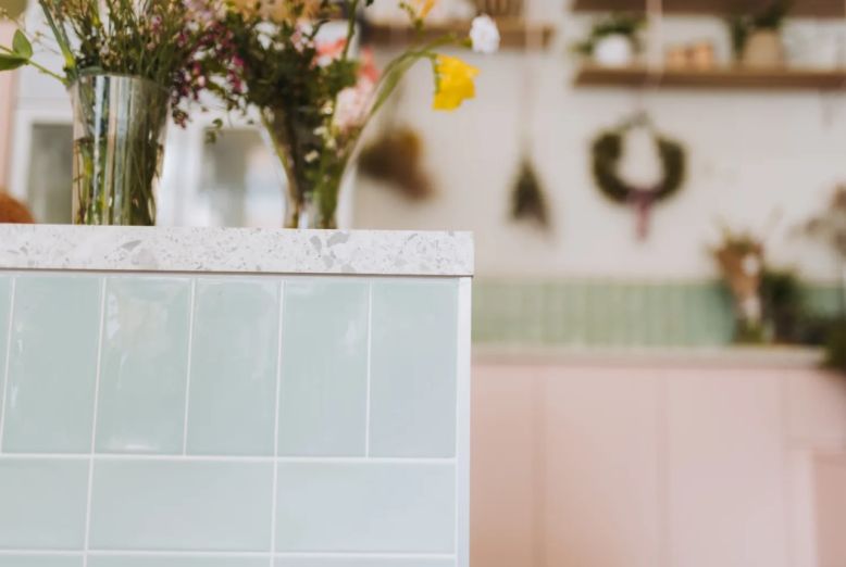 „Prodejní pult s deskou byl navržen v dekoru terrazza a ladí se stávající podlahou a zároveň kontrastuje s pastelově zeleným keramickým obkladem, který tvoří pomyslnou mozaiku po stranách pultu. Z obkladů vyzařuje klid, který doplňuje pestrobarevnou krásu květin,“ říkají architektky.