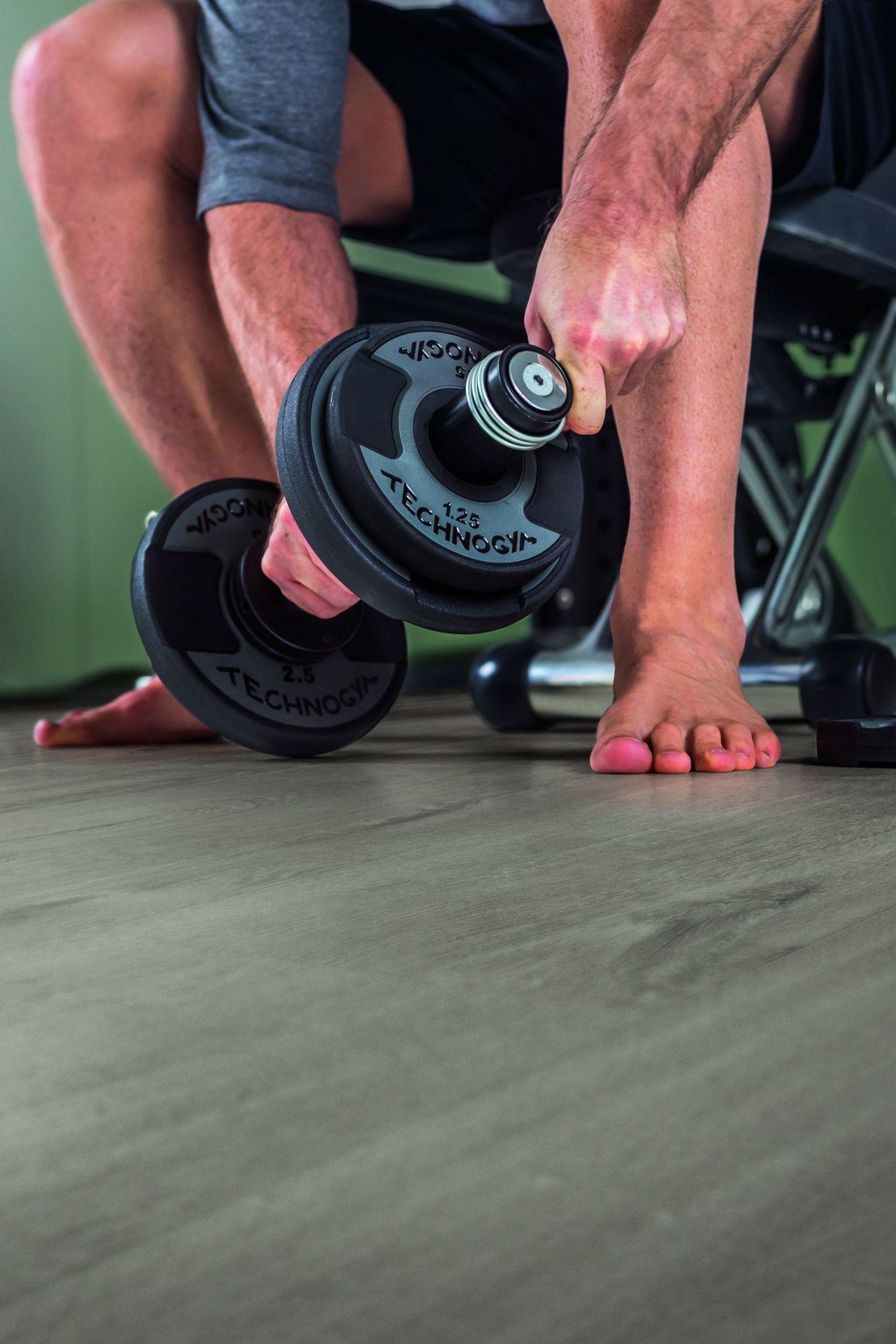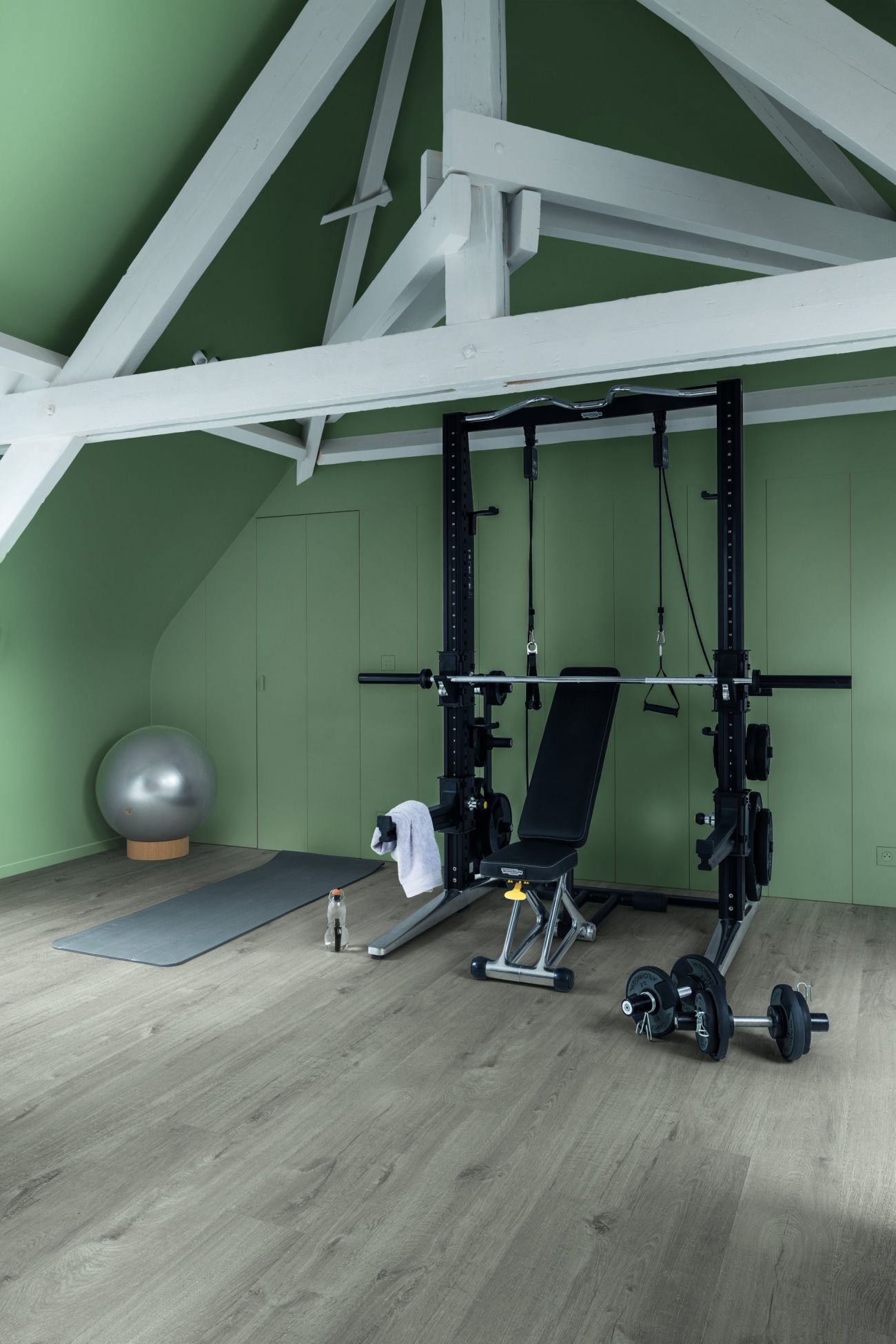 Příkladem může být Alpha Vinyl od Quick Stepu. Jeho ochranná svrchní vrstva a silné jádro uvnitř prken podlahu chrání před škrábanci a dopadem těžkých předmětů, jako jsou cvičící závaží. Povrch podlahy je současně teplý a příjemný na dotek. Vinyl navíc pohlcuje zvuk, a podporuje tak uklidňující charakter místnosti. Navíc při výběru dekoru máte několik možností, a to od vzhledu odpovídající dřevu po design podobající se kameni.