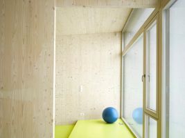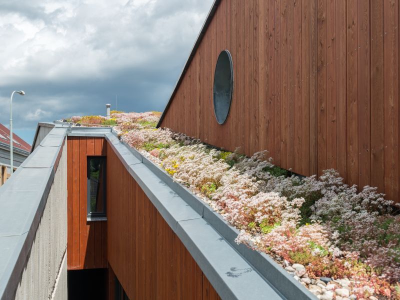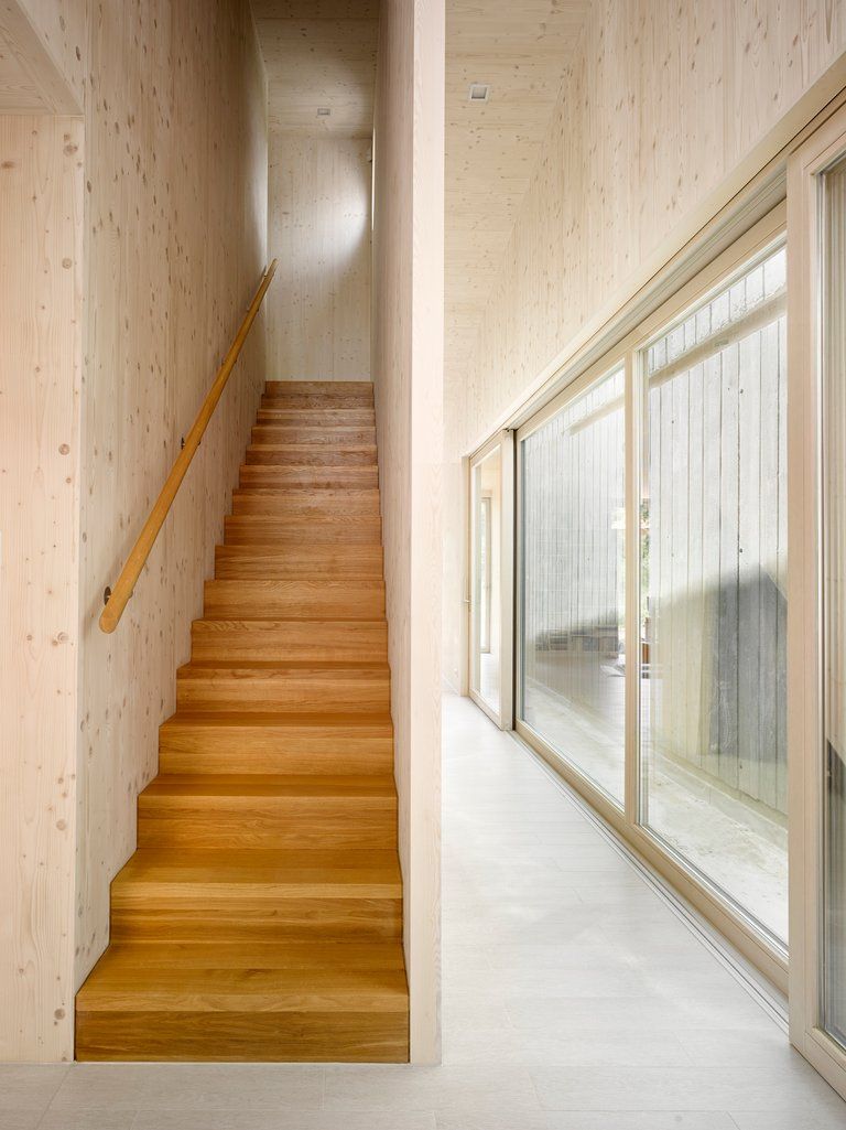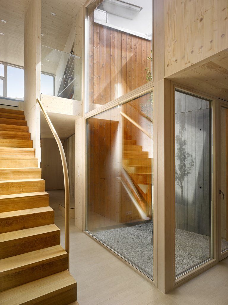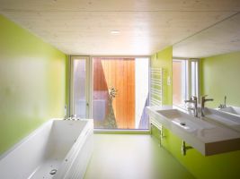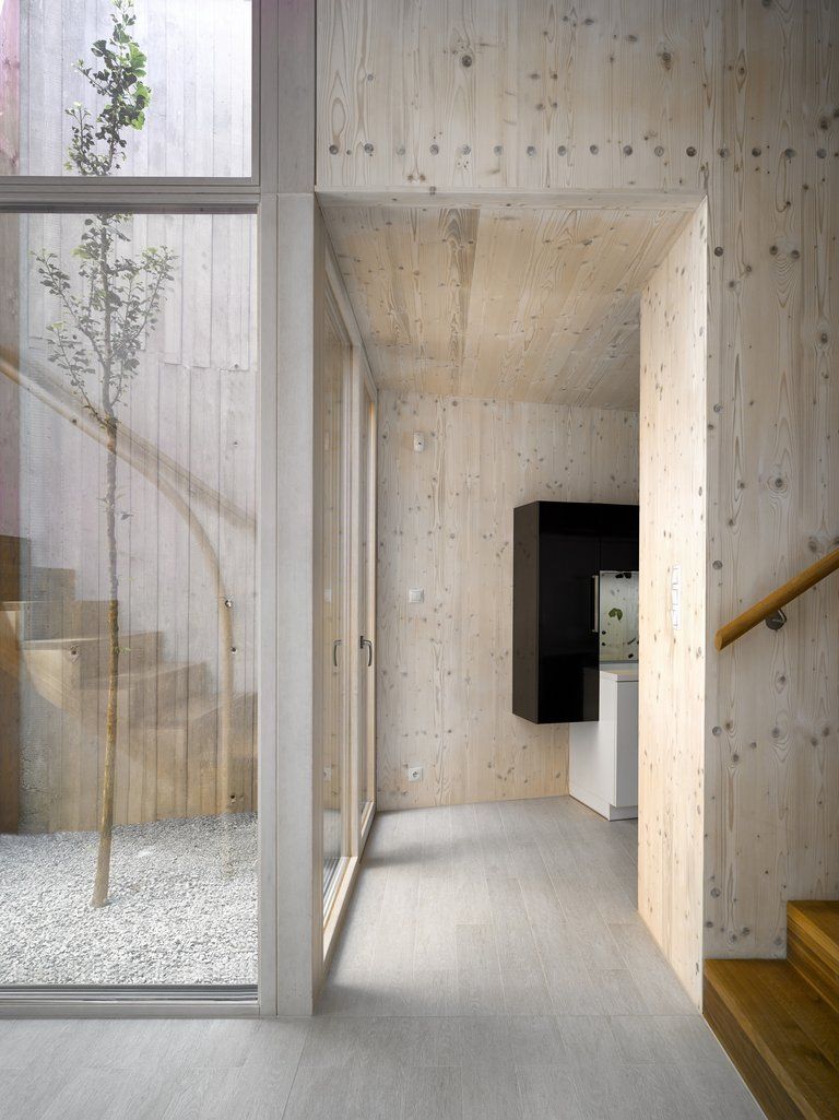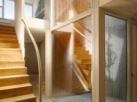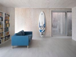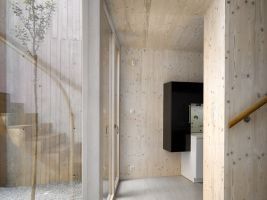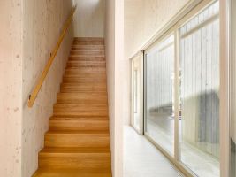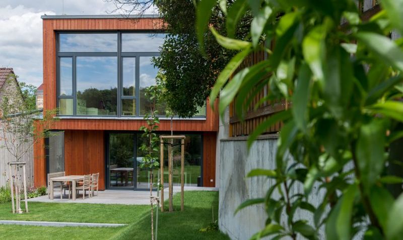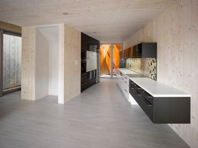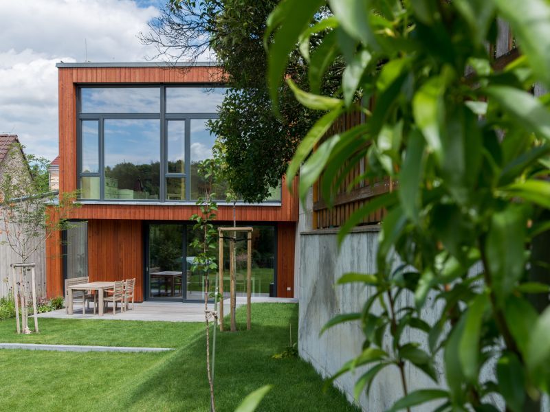 Dům využívá materiálů lokálních, obnovitelných a s minimální produkcí CO2. Navíc je mimořádně úsporný. „Konstrukce domu je z dřevěných křížem lepených CLT panelů. Stěny domu jsou oboustranně pohledové. Dům má také zelenou střechu a technologii pro nakládání s dešťovou vodou,“ říká architekt.