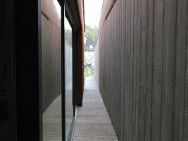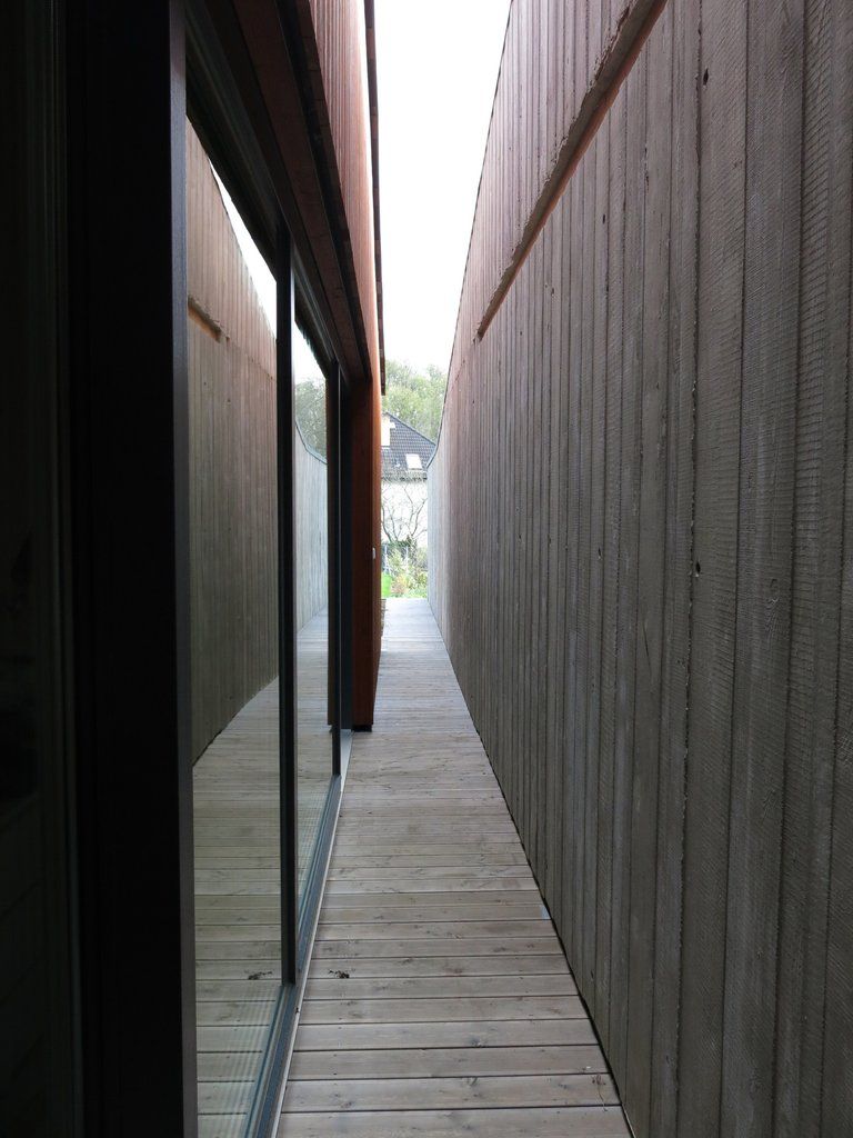 Dům v úžině, to je název stavby, která vyrostla na atypickém zbytkovém pozemku v řadové zástavbě v pražských Starých Butovicích. Jedná se o dřevostavbu s energeticky úsporným režimem a zelenou střechou. Pozemek má tvar přesýpacích hodin, v nejužším místě má jen čtyři metry. Vysoké stěny stavby kopírují krajinu a reflektují skály Prokopského údolí. Majitelé tak zde mají naprosté soukromí a krásné výhledy.