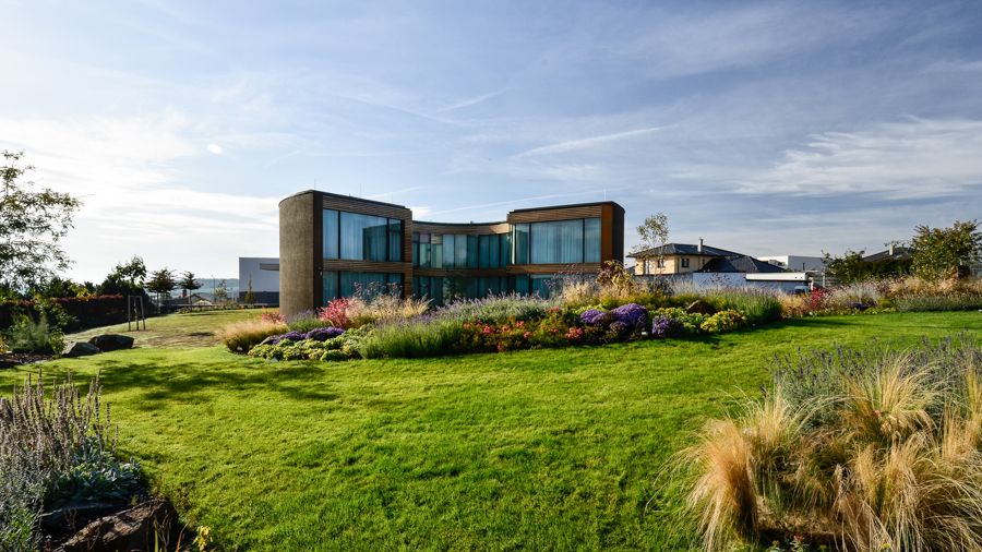 Díky netradičnímu tvaru je pozemek rozdělen na vstupní a klidovou část. Ve vstupní části se kruhový půdorys uzavírá a na klidové straně se naopak otevírá ve společenské prostory, kde najdeme rozlehlou zahradu a bazén.