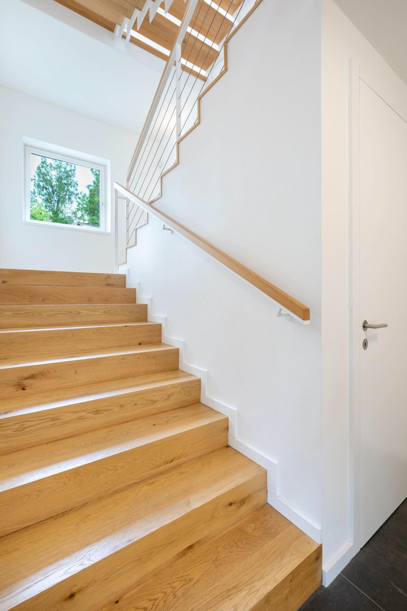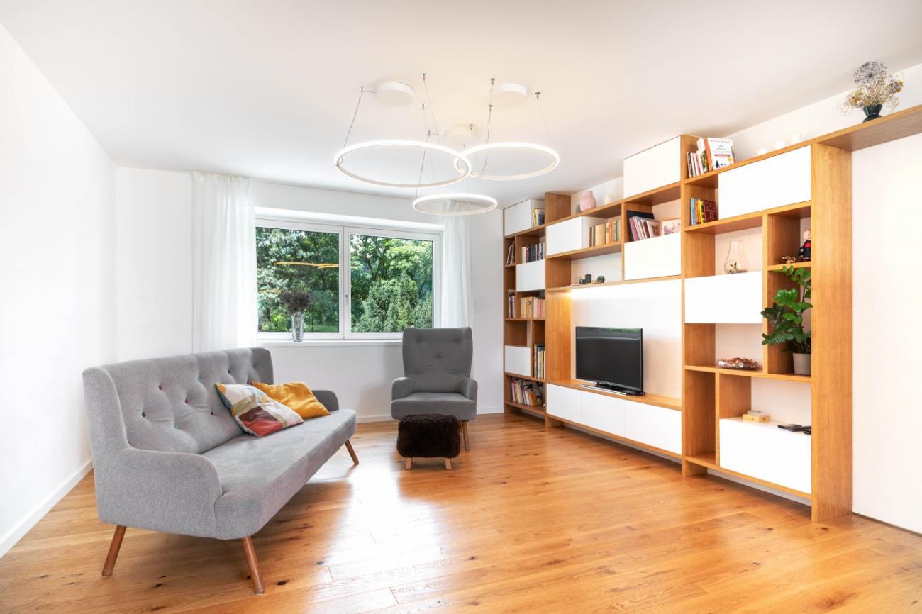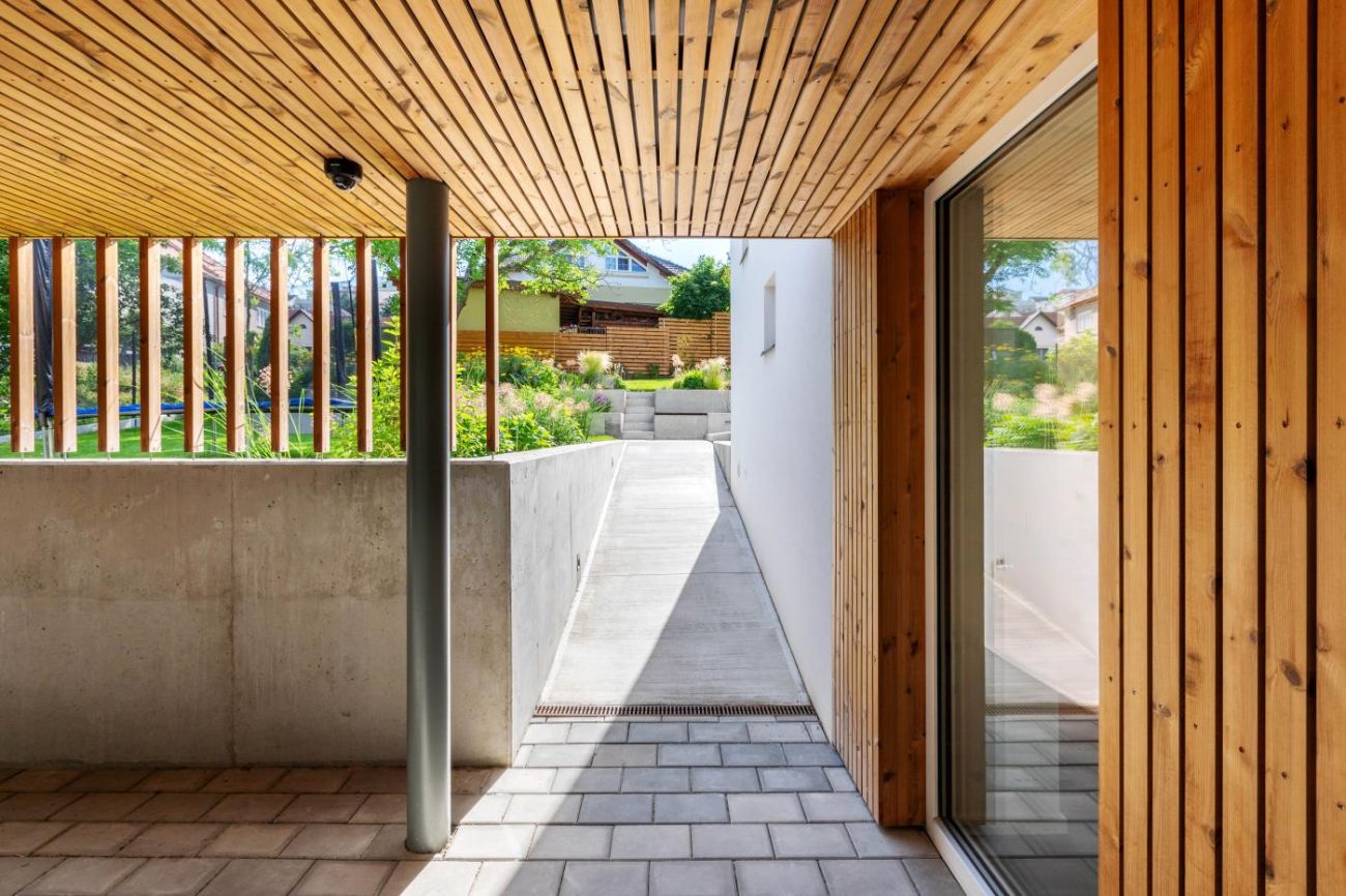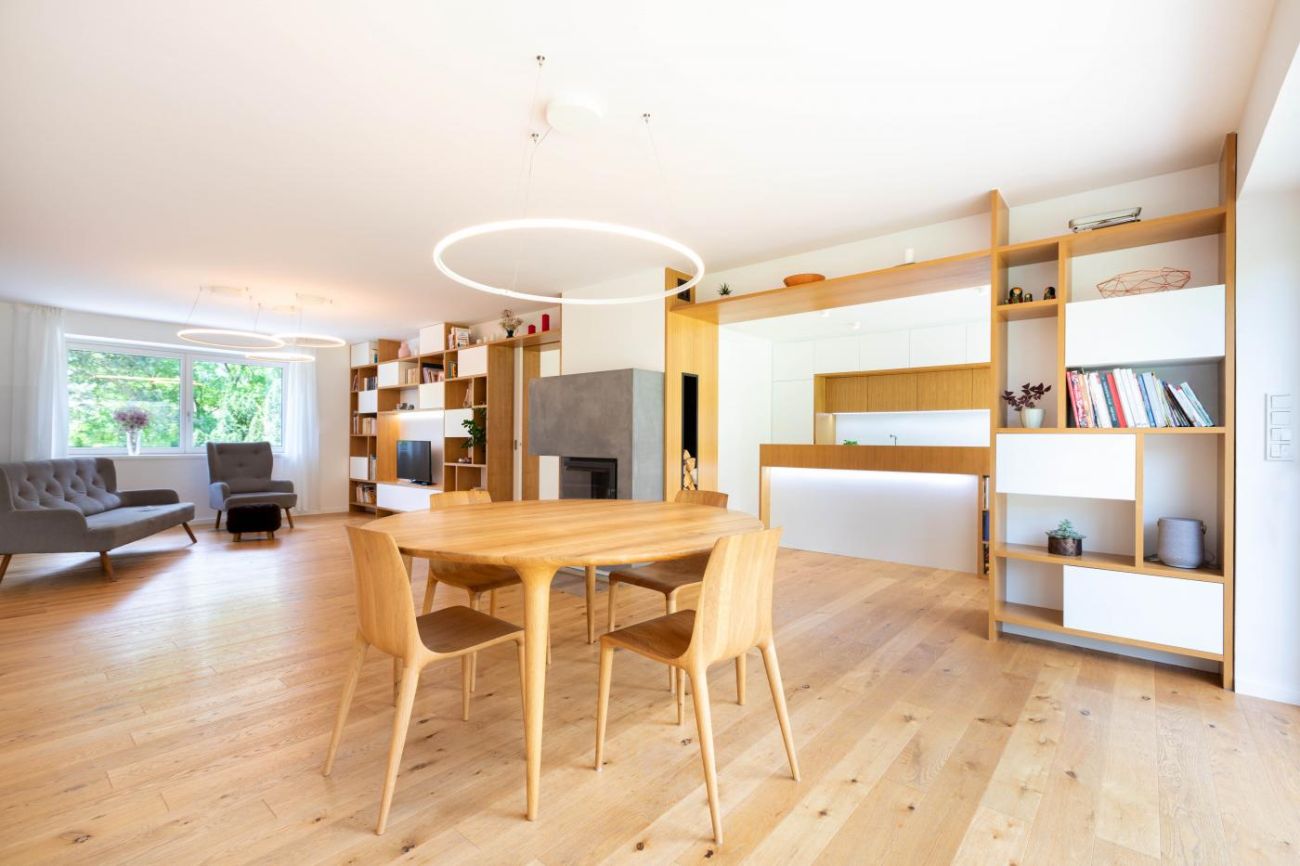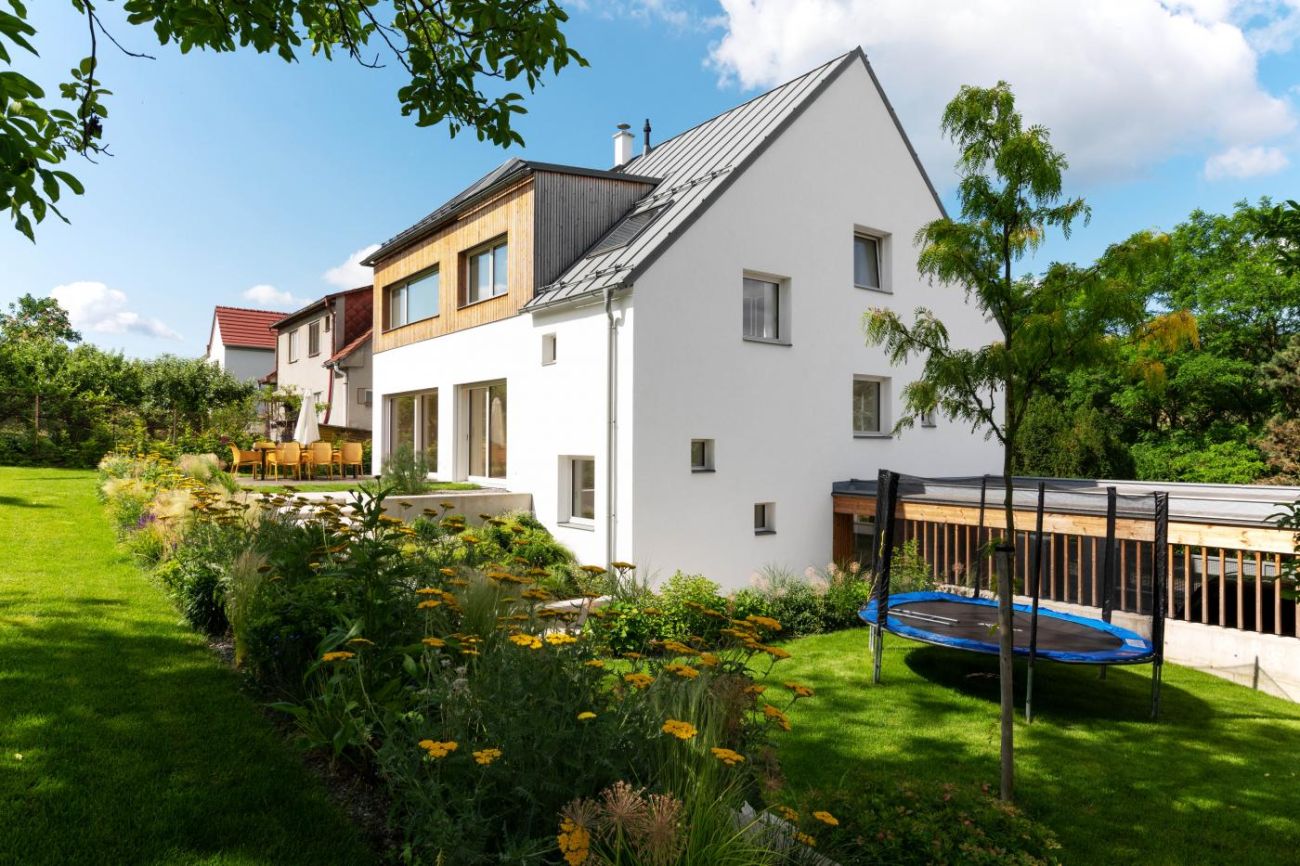 Součástí úprav domu byl zároveň i návrh celého pozemku. Podzemní podlaží domu bylo původně využívané jako technické s garáží. Nejzásadnějšími úpravami v zahradě bylo dorovnání terénu na úroveň podlahy v prvním nadzemním podlaží. Což umožnilo přímé propojení obytného podlaží se zahradou oproti původnímu stavu, kdy se do zahrady vstupovalo obcházením domu přes vstupní halu se schodištěm. „Při návrhu domu jsme se soustředili na propojení objektu se zahradou. Svažitý terén totiž nenavazoval na podlaží, proto byla součástí projektu i úprava zahrady. Dům jsme navíc prohloubili a vytvořili zde další bytovou jednotku,“ doplňuje architektka Michaela Vokřálová.