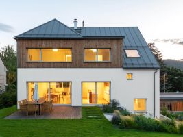 Zvolené materiály fasád kombinují omítané a dřevěné plochy. Střecha je plechová falcová v šedém odstínu stejně jako další plechové prvky. Rámy oken a vstupních dveří jsou dřevěné. Venkovní opěrné zdi a podezdívky uličního oplocení jsou pak z pohledového betonu.