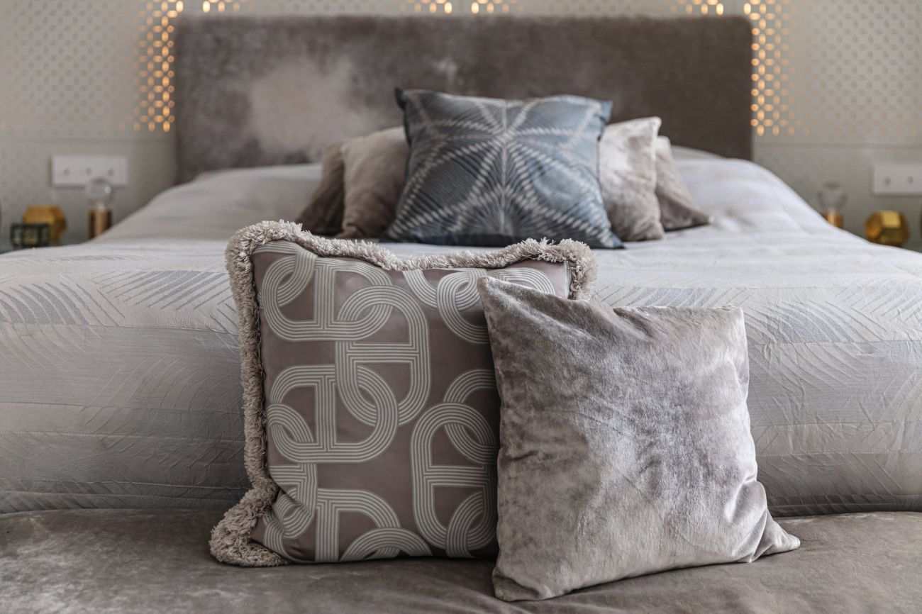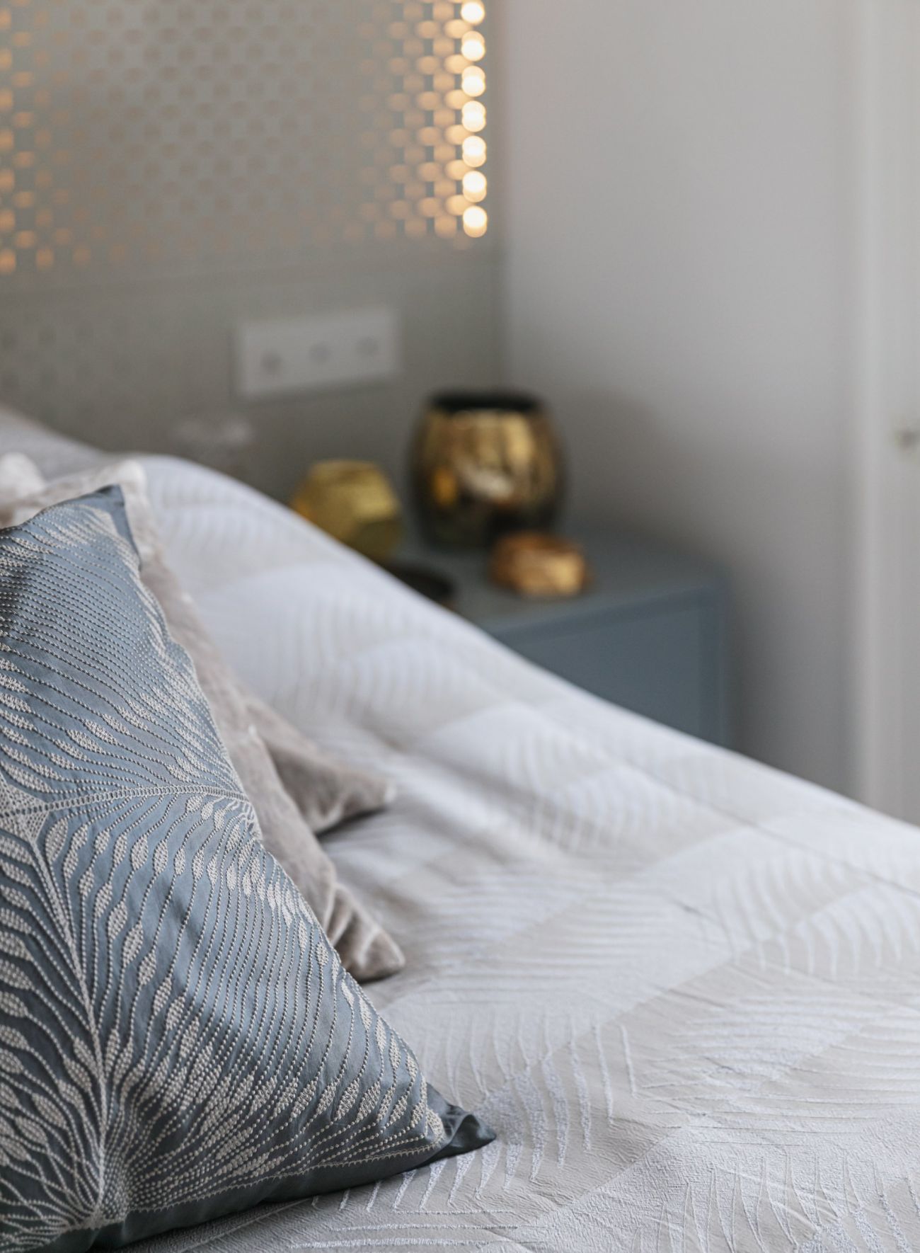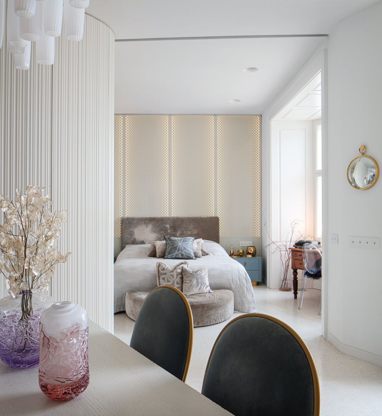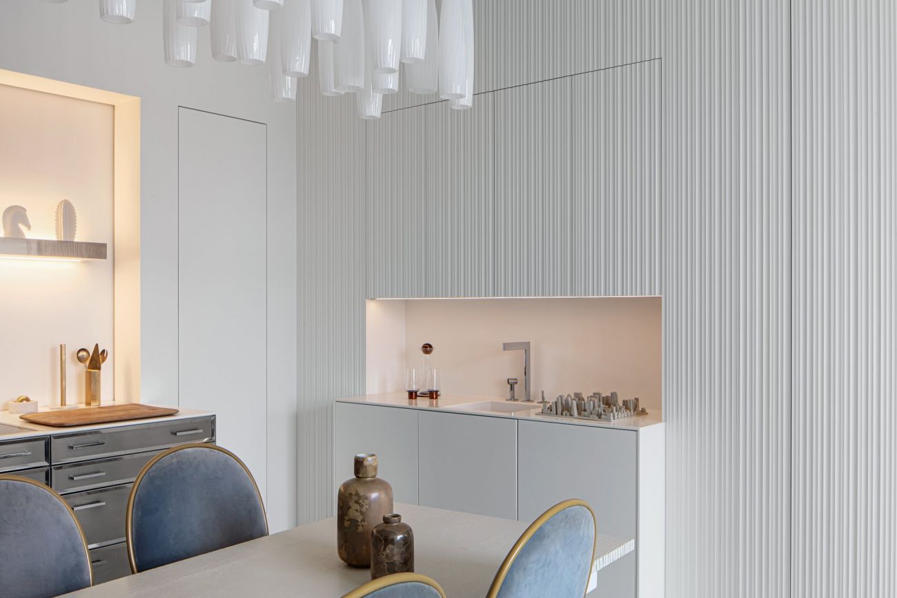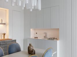 Velmi praktickým a čistě působícím řešením jsou skryté úložné prostory, které jsou téměř po celém obvodu bytu. Tato místa poté zdobí podsvícené ornamentální panely a konkrétní dekorace, ať už ty starožitné, nebo moderní.