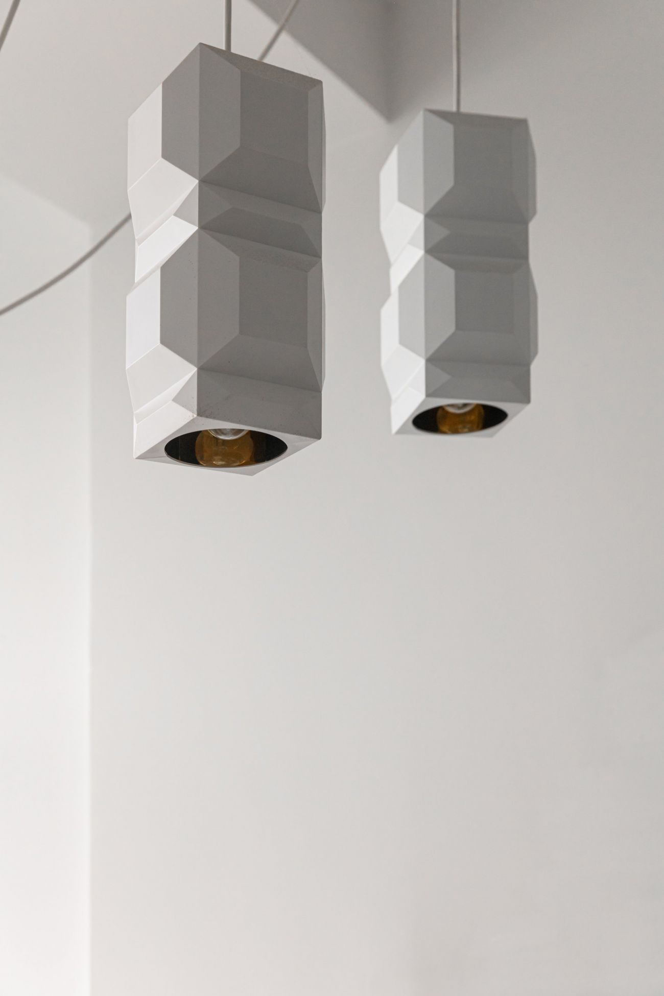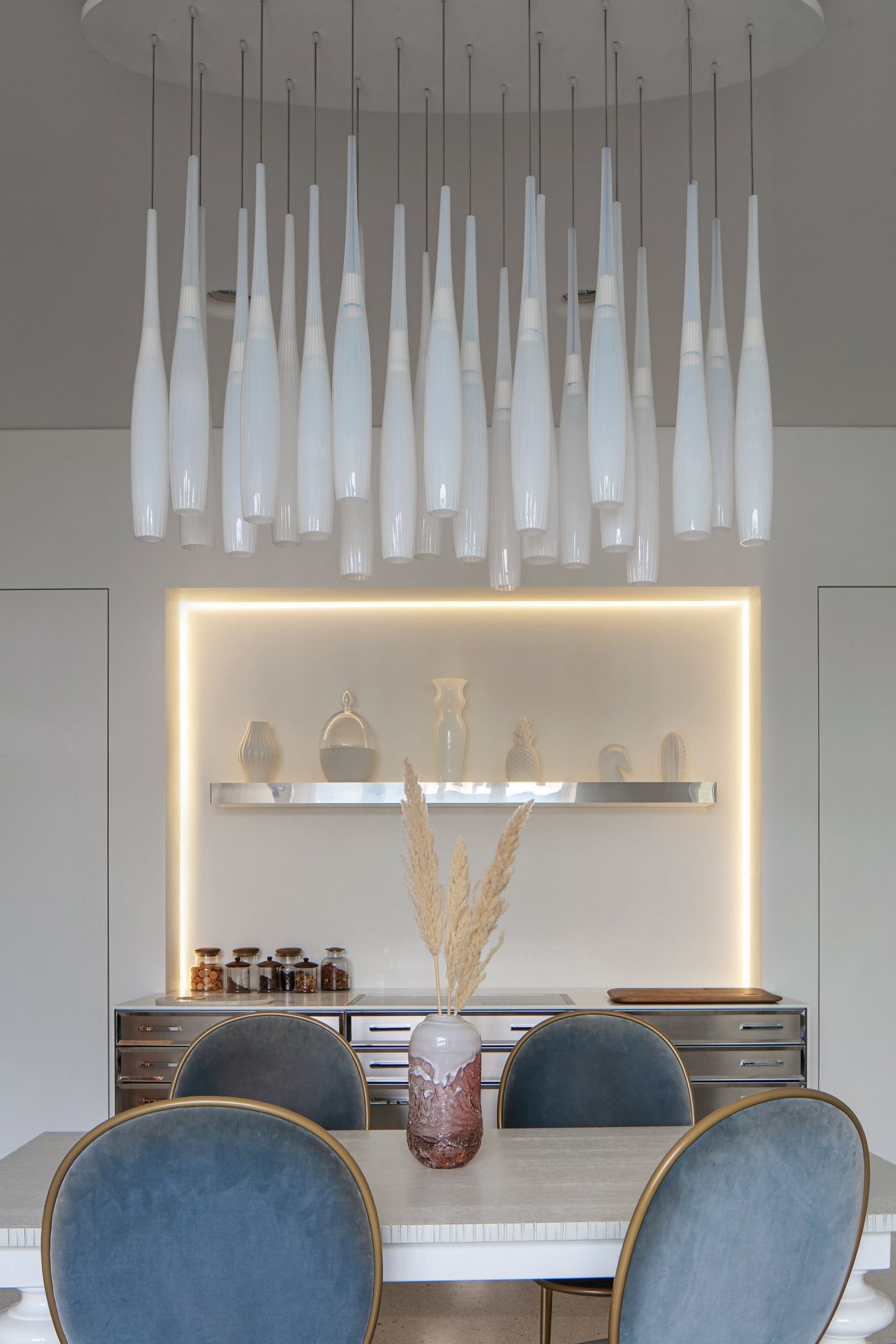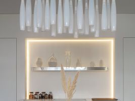 Nepřehlédnutelnou dominantou bytu je lustr od Ronyho Plesla, který tvoří 24 skleněných tubusů, které hrají úžasnou hru se světlem.