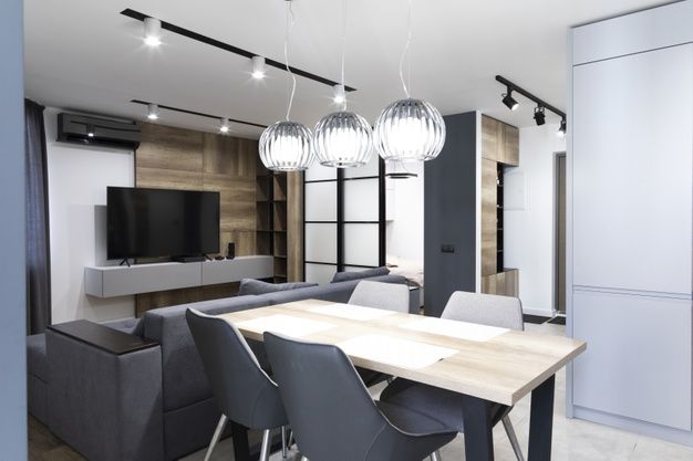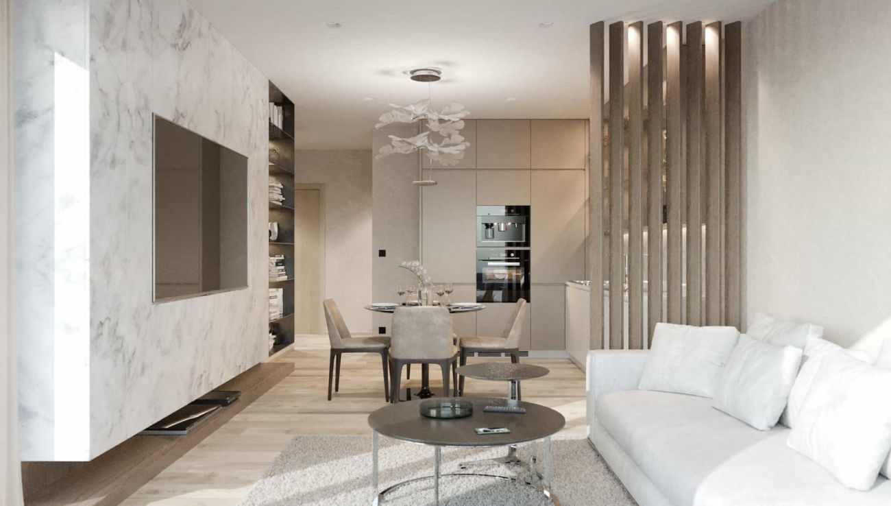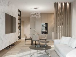 Středem obývacího pokoje by měla být prostorná sedačka z kvalitních materiálů. Konferenční stolek pořiďte skleněný či s mramorovou deskou. V interiéru volte nanejvýš dvě dominantní barvy. Doplňky vybírejte střídmě, do takového interiéru se hodí vkusné obrazy, mosazné sochy či výrazné designové vázy. Mramorovou podlahu skvěle doplní kvalitní a barevně střídmí kusový koberec. Do interiéru se hodí velké zrcadlo a elegance docílíte například i centrálním křišťálovým lustrem. Každý městský intelektuál se pak neobejde bez stylové knihovny s významnými tituly.