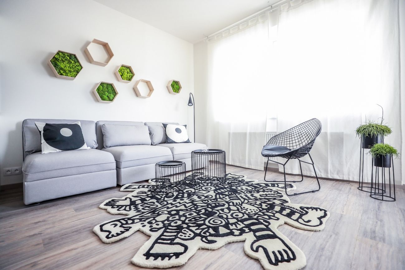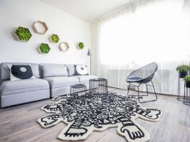 Druhý vzorový byt 2+kk vychází ze stejných principů a evokuje opět skandinávský styl, jak líčí designérka: „Obdobně jako u předešlých realizací jsem zde kladla důraz na jednoduchý a světlý interiér s jasným vnímáním prostoru. Do něj jsem pak vnesla kombinaci tradičních přírodních materiálů s moderními, například hřejivého dřeva s chladným kovem.“ Právě ten je jedním z výrazných prvků celého interiéru. V obývací části se nachází stolky a křeslo v kovovém provedení, jež vnesly do bytu zajímavý industriální nádech, ale také zachovaly eleganci a díky černé barvě rovněž střídmost. Nechybí zde ovšem ani dotyk přírody. Stěnu zdobí kreativní plastika, jež představuje reminiscenci v duchu včelích pláství, kterou navíc doplňuje živý mech. Motiv plástve se opakuje i v ložnici, kde je zpodobněna abstraktním obrazcem z nití. Působivé dekorace nejlépe vyniknou v prostředí laděném do tlumených, decentních tónů. Designérka proto byt navrhla v klasické elegantní bílo-šedé kombinaci: kuchyně v bílém provedení se šedou deskou, šedá rovná sedačka, v ložnici bílá postel s částečně šedým povlečením a bílými závěsy. Oba interiéry jsou vybaveny světly značky Eglo a v koupelně obklady a dlažbami Marazzi.