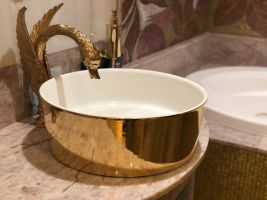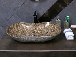 Další možností je umyvadlo na desce. To vypadá jako samostatná nádoba, mísa postavená na dřevěné či kamenné desce. Tvar umyvadla vynikne, s jeho výběrem si tedy vyhrajete.