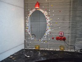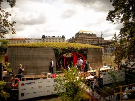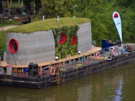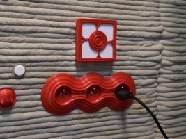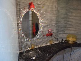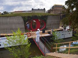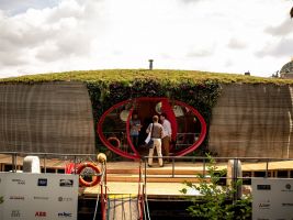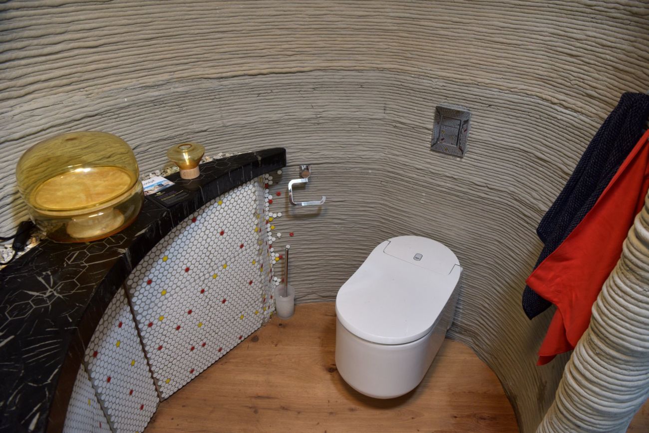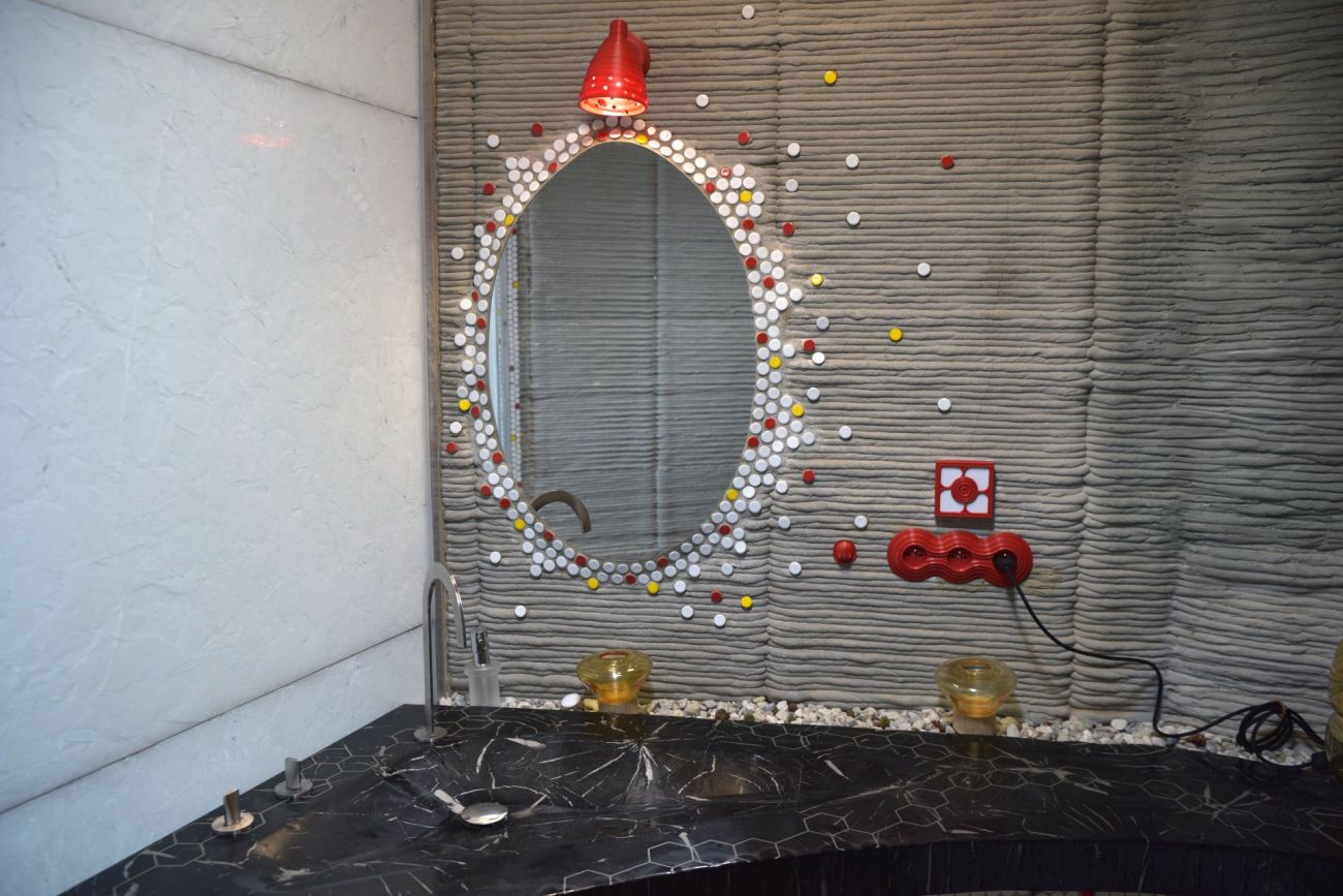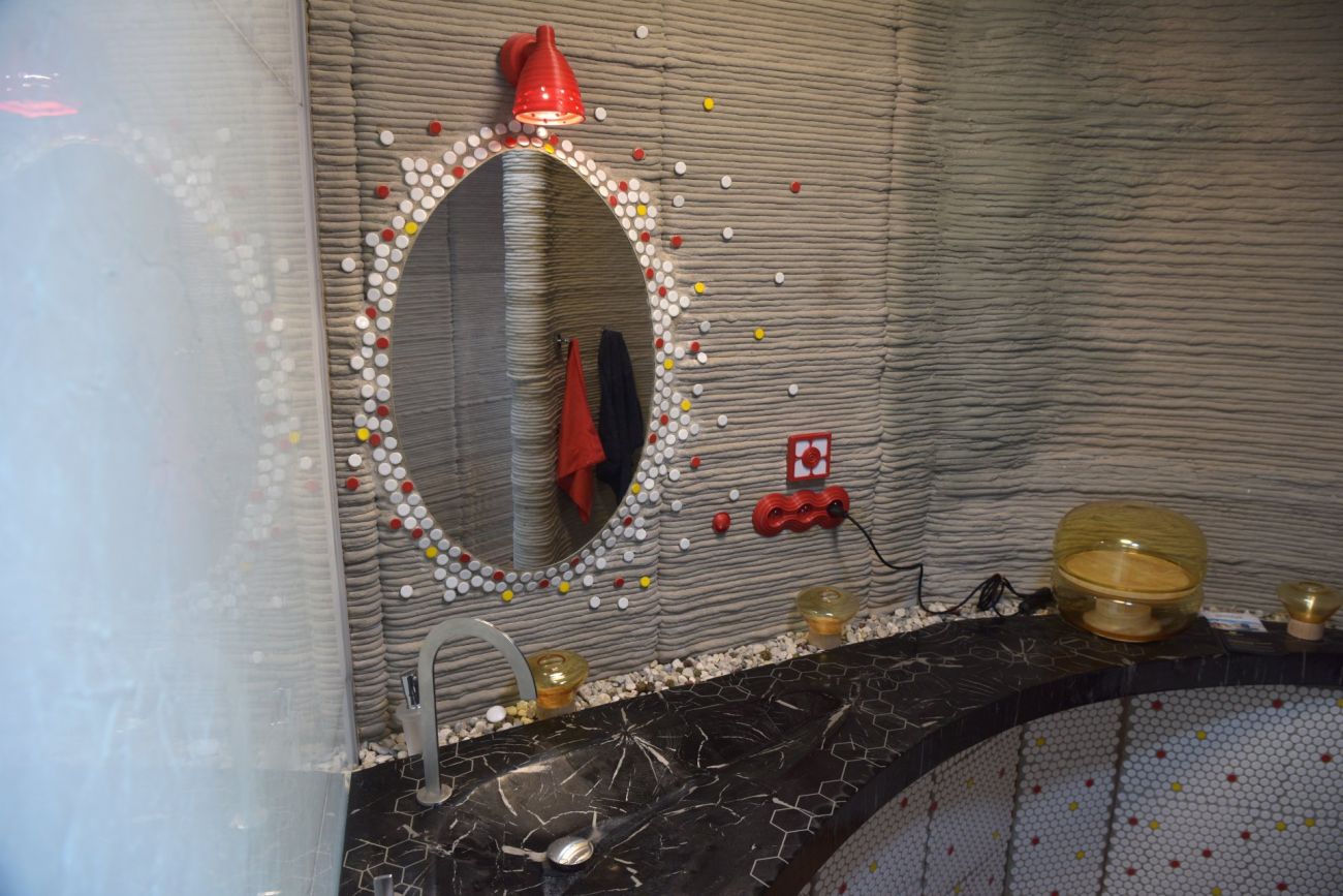Hlavním materiálem baterie, která byla vytištěna na 3D tiskárně, je práškový titan. Baterii dodala firma Grohe. Recirkulační sprcha šetří až 90 % vody. Odpadní voda z koupelny je využita k zalévání. V galerii níže si můžete také prohlédnout mozaika se zrcadlem. Skleněná zástěna je vyrobena z recyklovaných střepů.