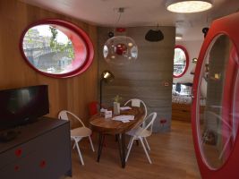 Vyrobena ze dřeva a propojena s tištěnou stěnou pomocí dřevěného rámu. Rám je ke stěně přidělán pomocí speciálních zámků. Okna byla vyrobena na míru. Masivní stůl z tropického dřeva.