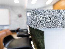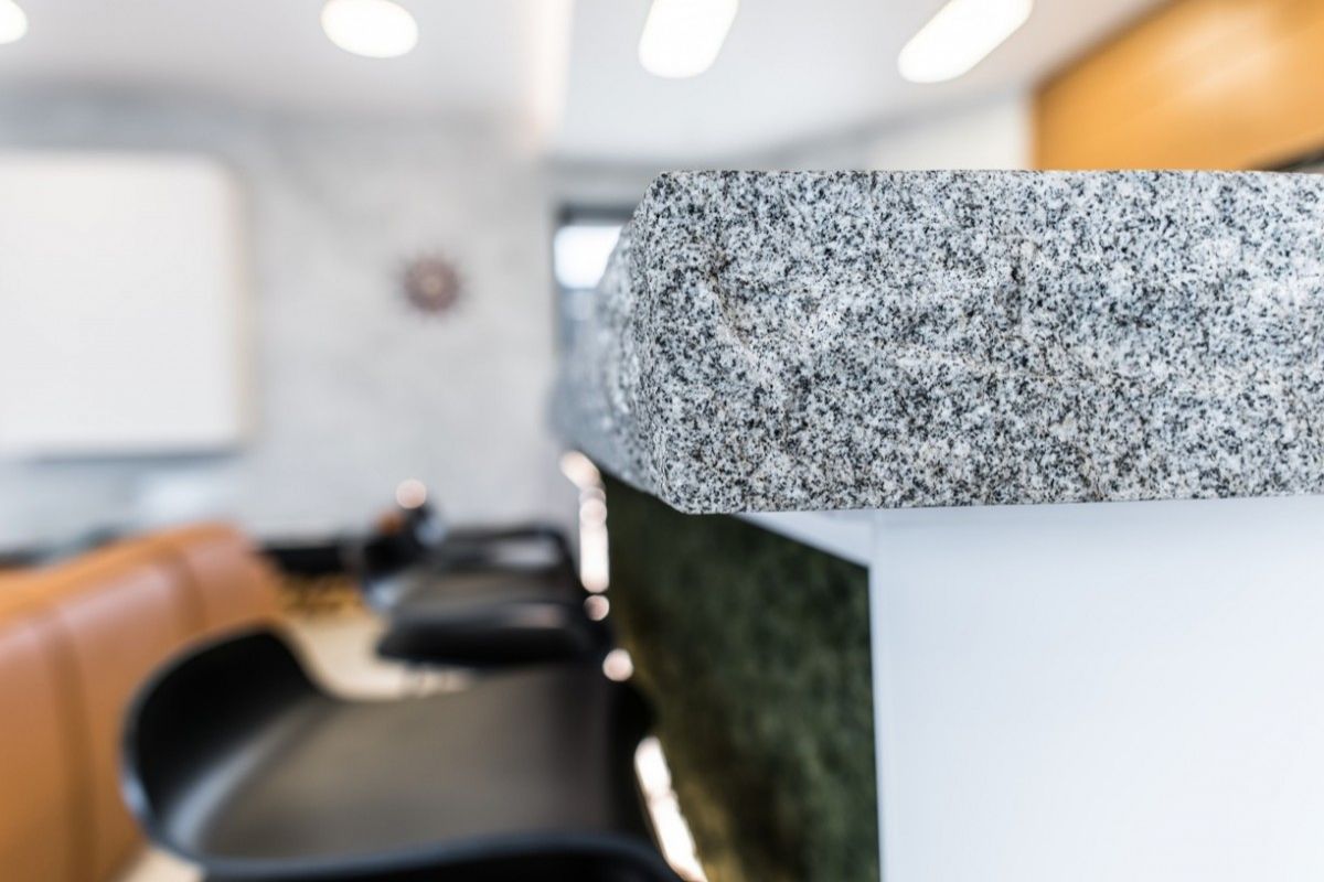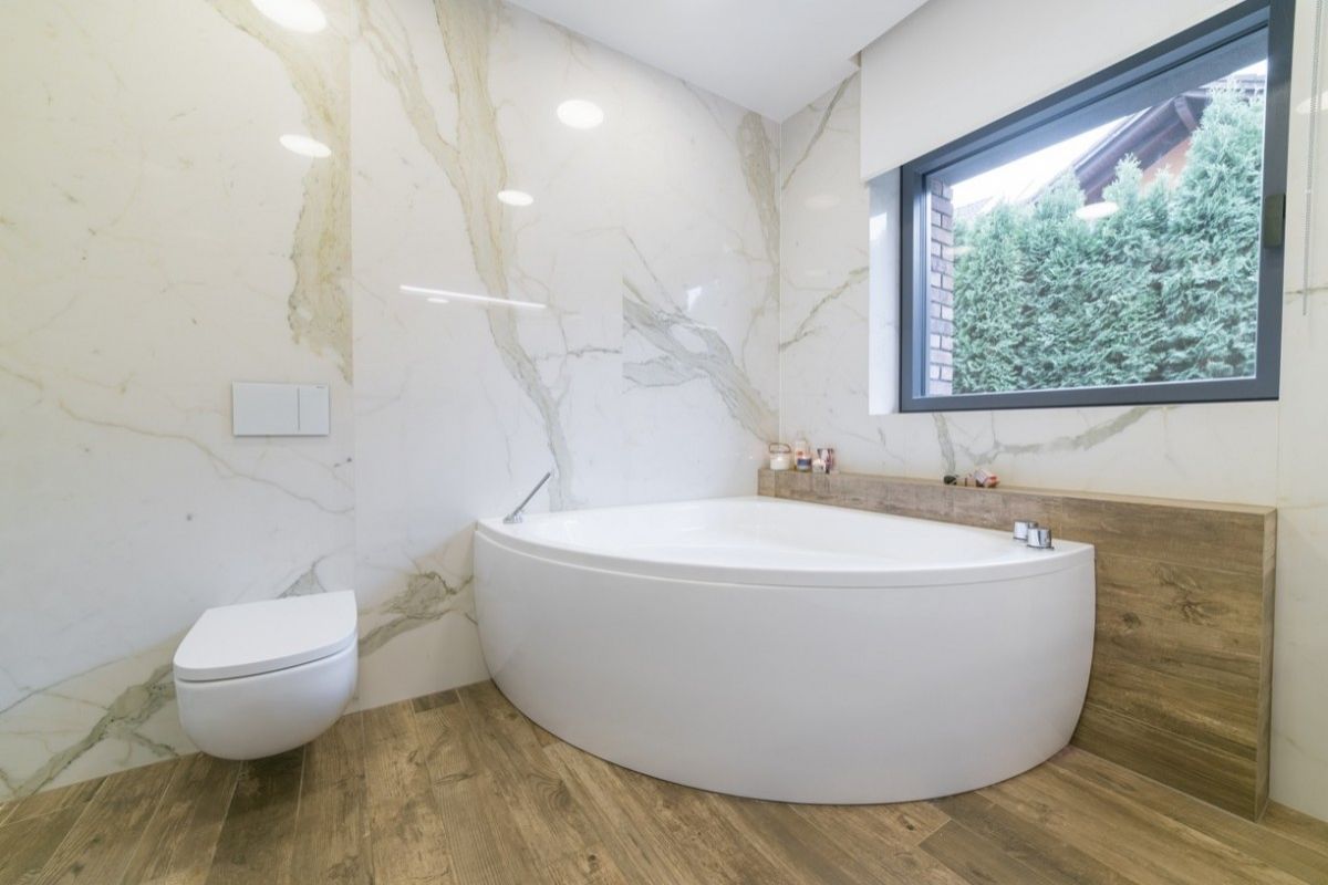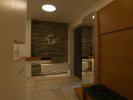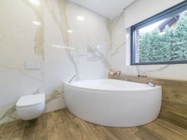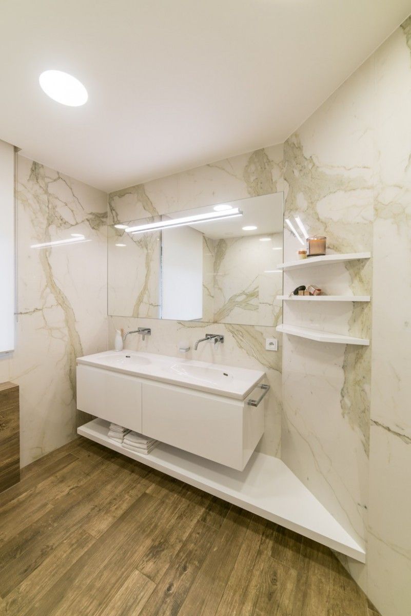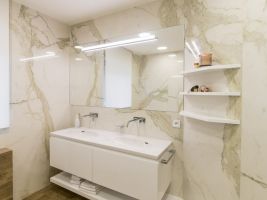 Pro koupelnu byly vybrány velkoformátové obklady FMG Callacata 150x300 cm s kompaktní celistvou výškou na celou světlost místnosti s výrazným dekorem imitující mramor v kontrastu s dlažbou v imitaci dřevěných dubových prken. Velkoformát obkladu vytvořil celistvost a kompaktnost prostoru v kontrastu s dlažbou.