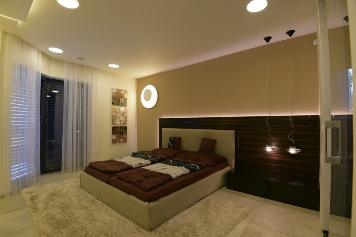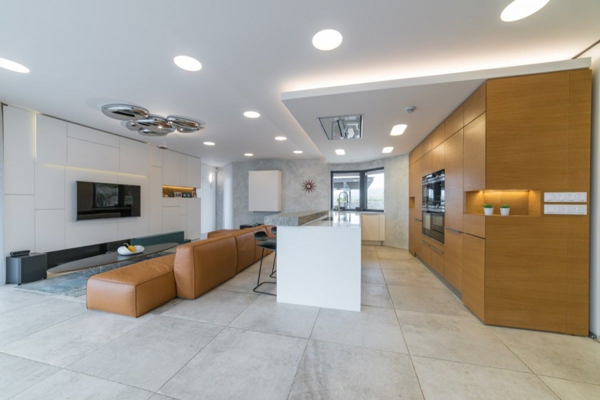 Centrem rodinného domu se stal velký prostor obývacího pokoje s kuchyní a jídelním koutem. V interiéru byly použity decentní velkoplošné materiály v kontrastu s výraznými solitérními interiérovými prvky, doplňky a zařízením.