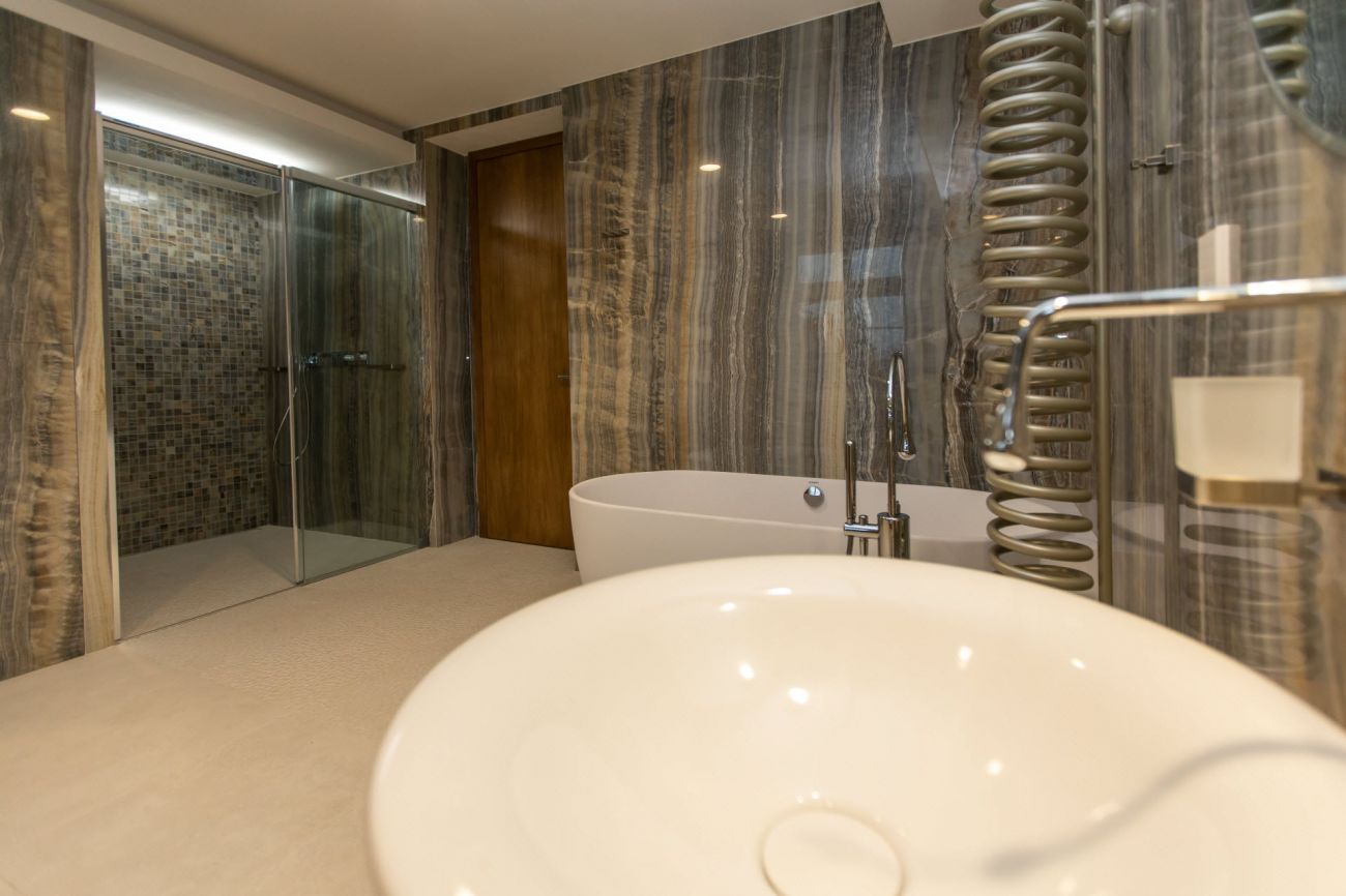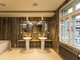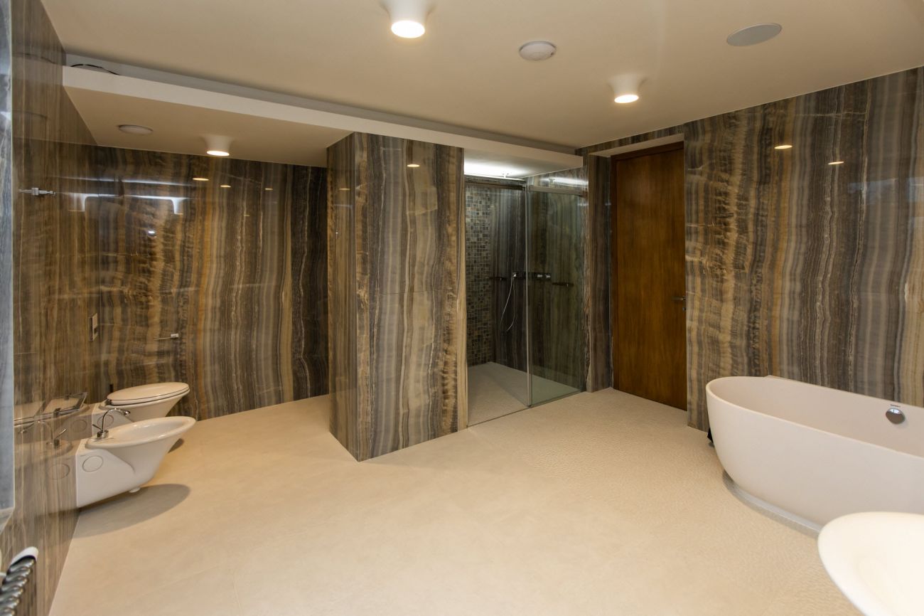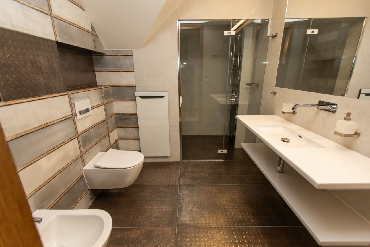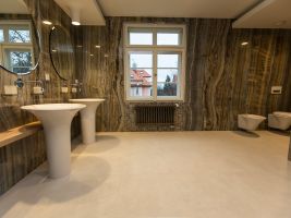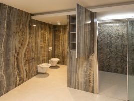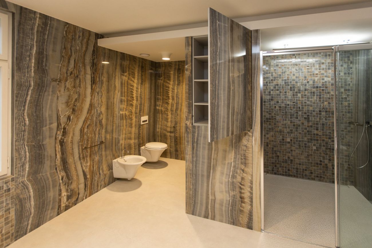 Velkoformátové dlažby, prosvícená stěna z onyxu, top sanitární keramika, wellness, koupelnový nábytek na míru, atd. Ve výrobním závodě TechnoArt se pro tento projekt vyráběli netradiční mozaiky Trapezzo a také speciální tvarové prvky s hranou K2 na celé schodiště.