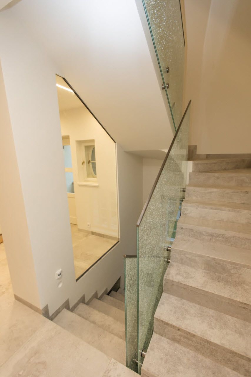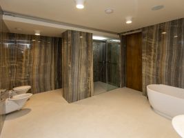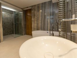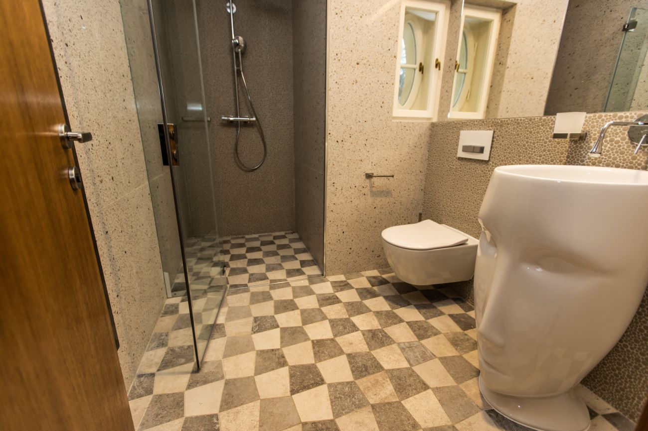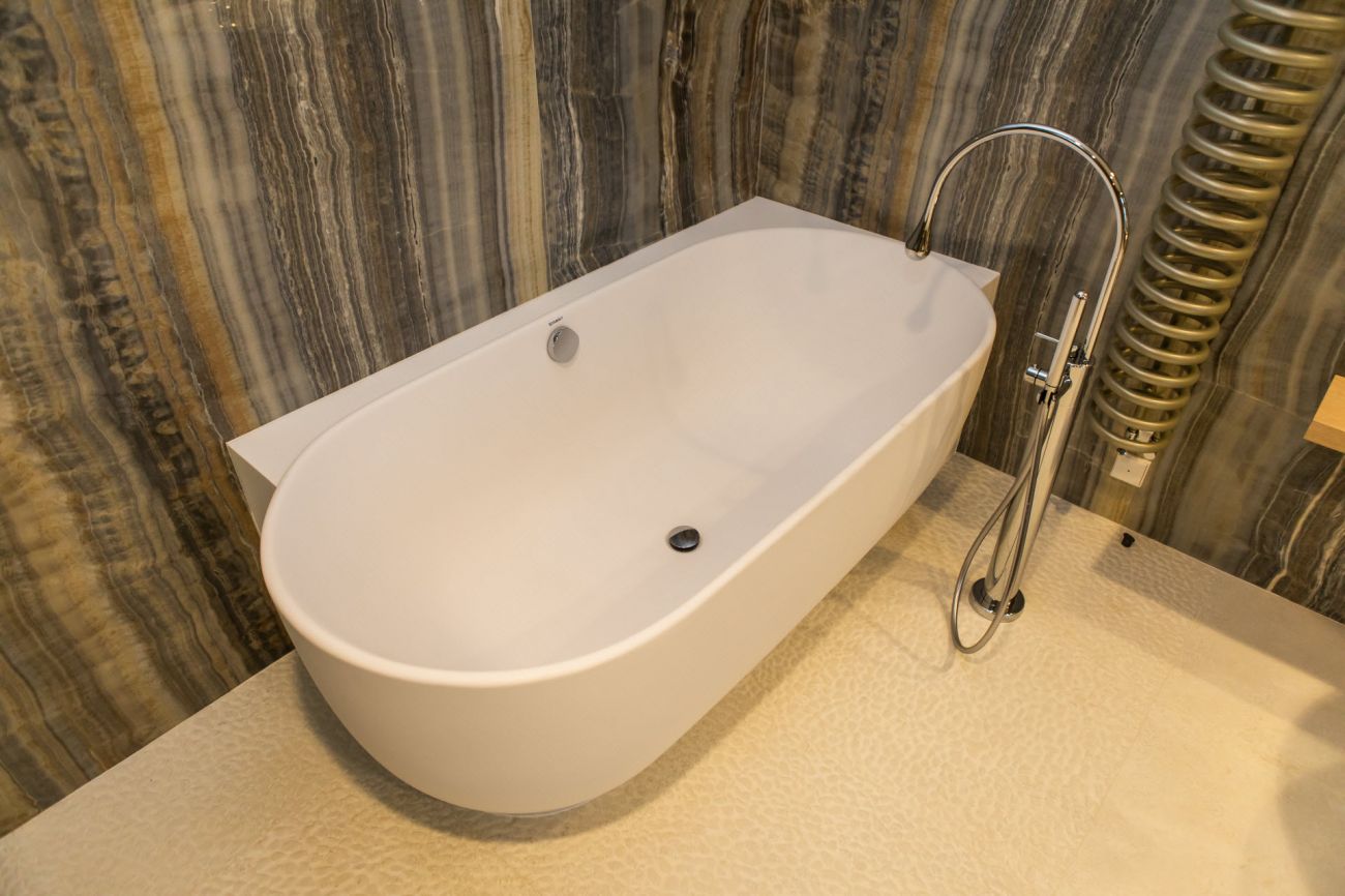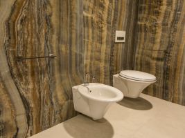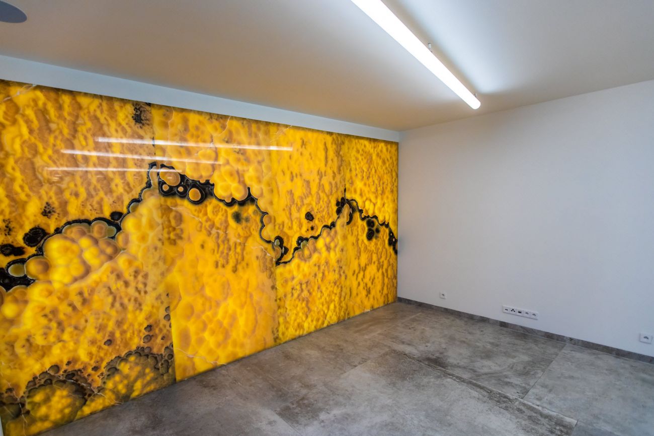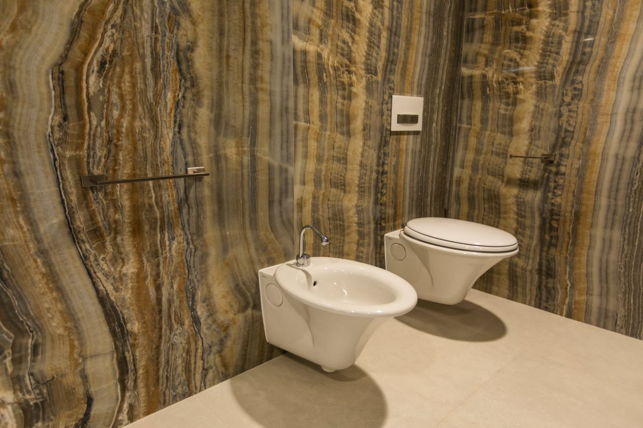 Velkoformátové dlažby, prosvícená stěna z onyxu, top sanitární keramika, wellness, koupelnový nábytek na míru, atd. Ve výrobním závodě TechnoArt se pro tento projekt vyráběli netradiční mozaiky Trapezzo a také speciální tvarové prvky s hranou K2 na celé schodiště.