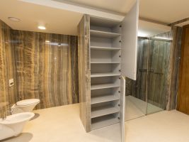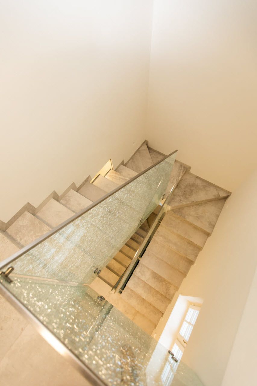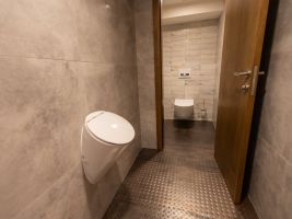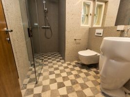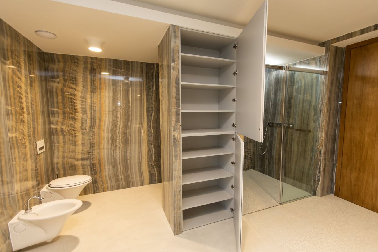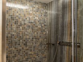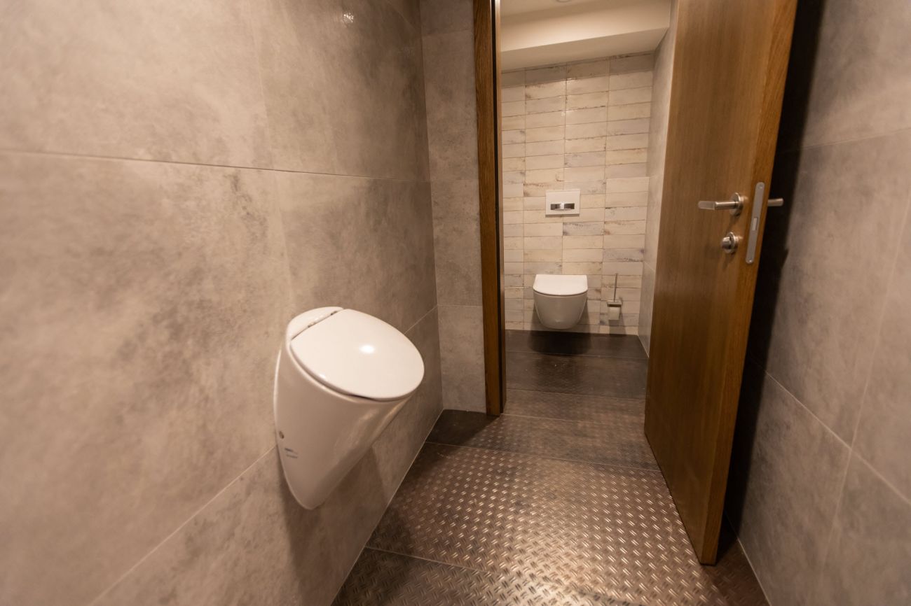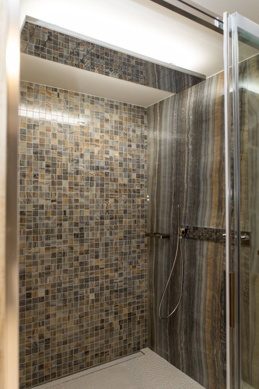 Velkoformátové dlažby, prosvícená stěna z onyxu, top sanitární keramika, wellness, koupelnový nábytek na míru, atd. Ve výrobním závodě TechnoArt se pro tento projekt vyráběli netradiční mozaiky Trapezzo a také speciální tvarové prvky s hranou K2 na celé schodiště.