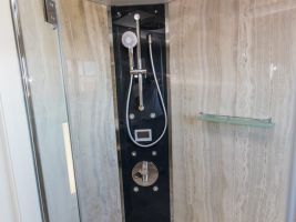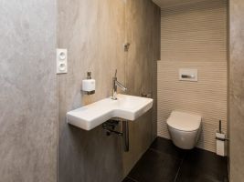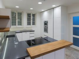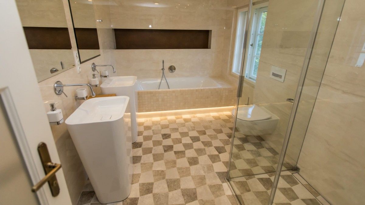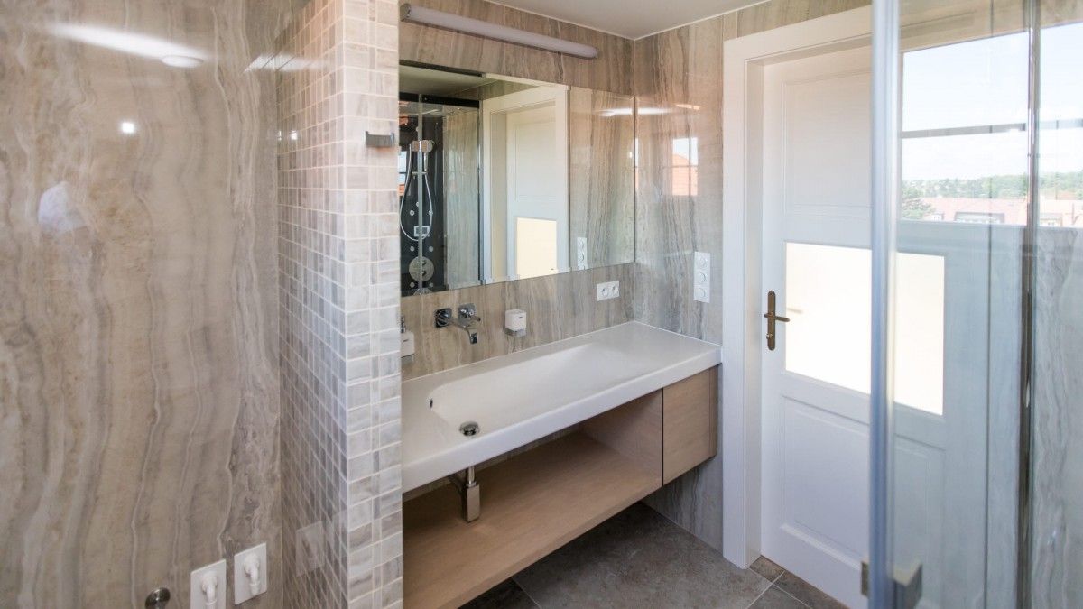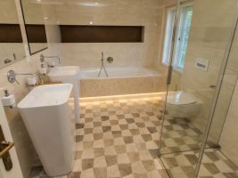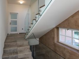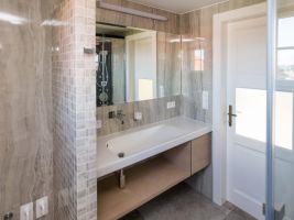 Dlažby a další zařizovací předměty do vily v pražské Ořechovce jsou dle návrhu Ing. arch. Petra Horáka. Ve větší části domu byla použita dlažba La Roche Ecru naturale včetně obložení schodů v dolní části domu. Kuchyňská deska, mozaiky, schodovky a podstupnice byly vyrobeny na zakázku v našem výrobním závodu TechnoArt. Z velkoformátových obkladů jsme dodali obklad MaxFine Travertino v rozměru 150x300 cm v tloušťce 0,6 cm. Za zmínku určitě stojí obložení obkladem z pravého kamene Onyx Macedonina, který je podsvícený. V koupelně mimo jiné vynikají zvolená stojací umyvadla od společnosti Kaldewei Meisterstück Emerso.