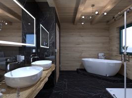 Zcela znovu navrhnout je potřeba sprchu, vanu, umyvadla, umístění WC i nábytek. Naštěstí v dnešní době už je na výběr z mnoha stylů obkladů a dlažby, které korespondují s rustikálním stylem. Možností je ale mnoho a pokud nejste zrovna milovníky venkovského stylu, vězte, že i z moderních materiálů lze vykouzlit stylovou koupelnu v šumavské roubence.