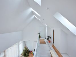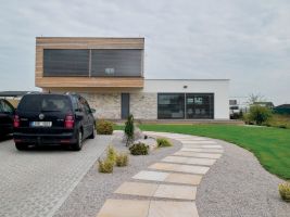 Dalším příkladem použitých materiálů a stavebních technologií, je přízemní objekt s obytným podkrovím rodinného domu v Černošicích. Byl navržen v nízkoenergetickém standardu a jedná se opět o dřevostavbu s interiérem sestaveným z desek RIGIPS. Sádrokartonové jsou jak obvodové nosné stěny, tak i příčky a podhledy.