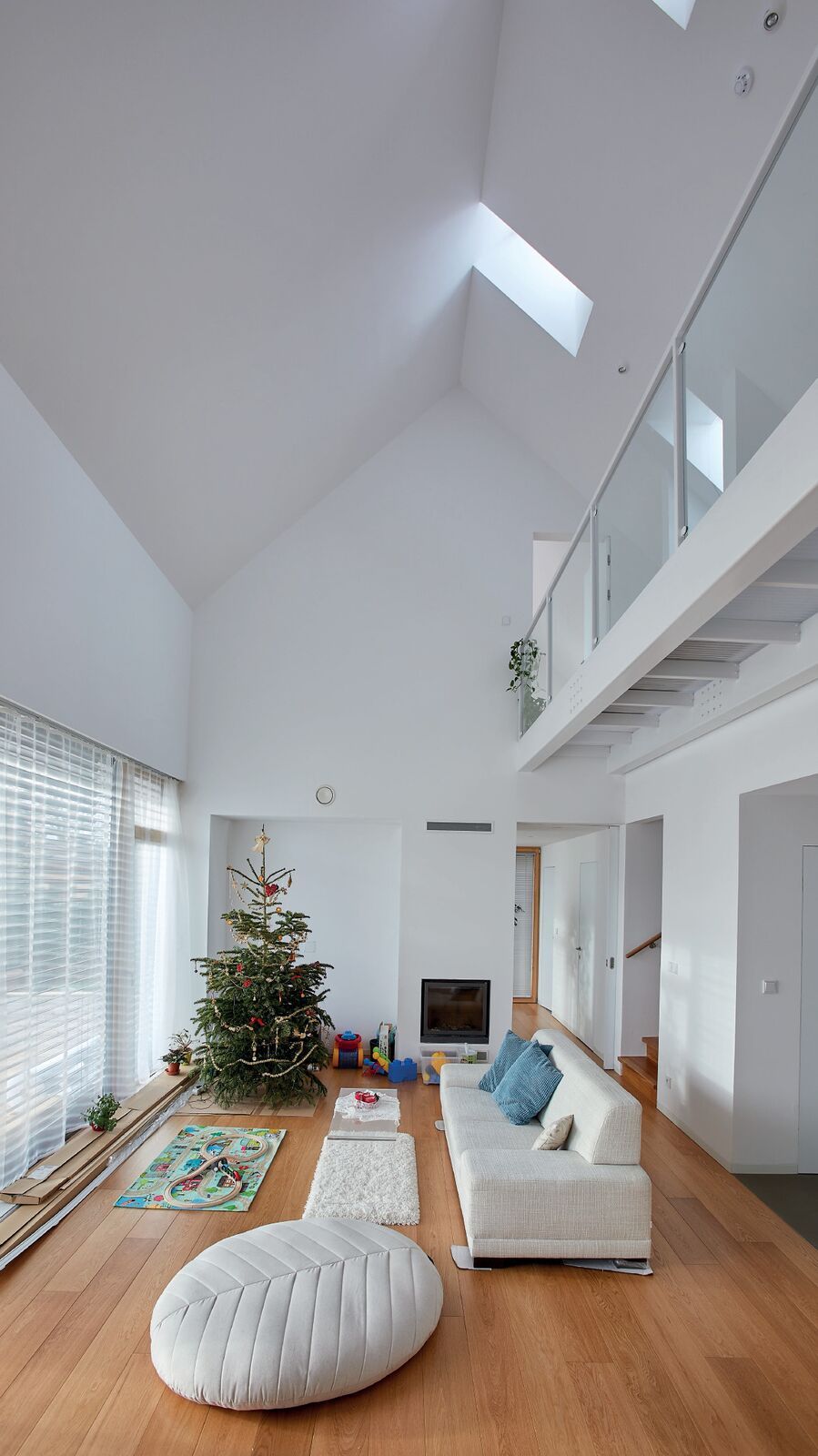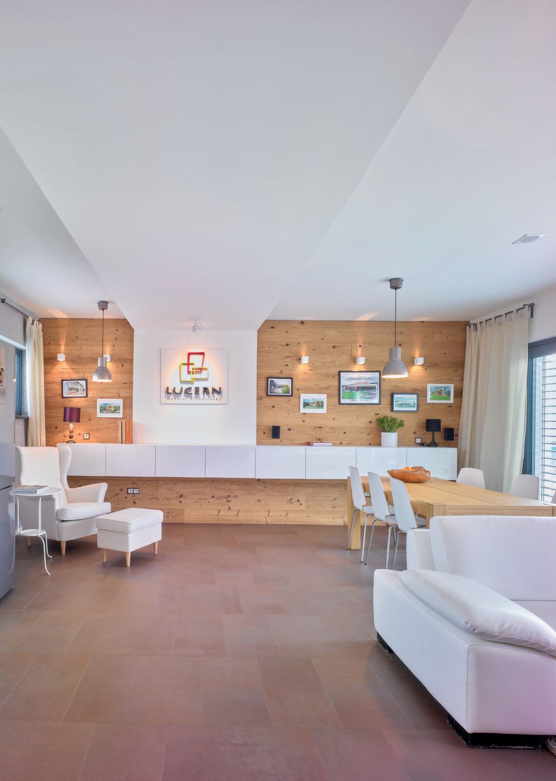 Sádrokartonové desky v rodinném domě v Levíně jsou v objektu použity na všech stranách. Ze sádrokartonu jsou vnitřní příčky, podhledy i podlahové desky RigiStabil. Vyznačují se vysokou neprůzvučností, zaručují rovinnost konstrukcí, odolávají vlhkosti a umožňují snadnou aplikaci elektrického i teplovodního podlahového vytápění.