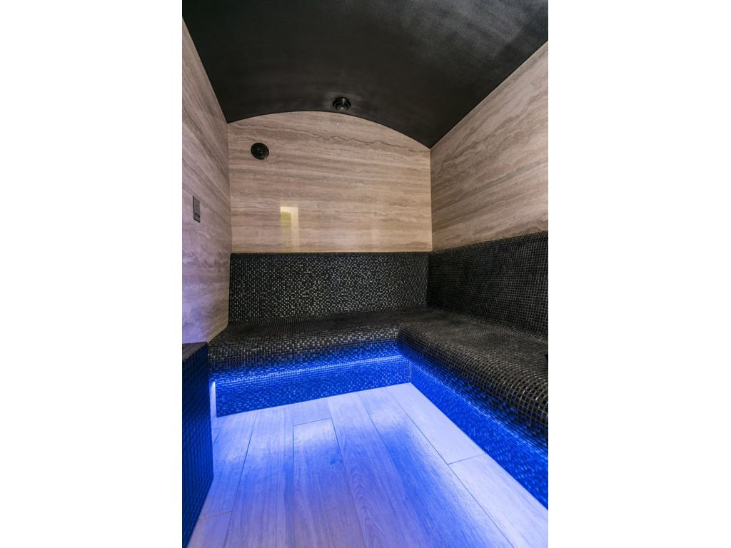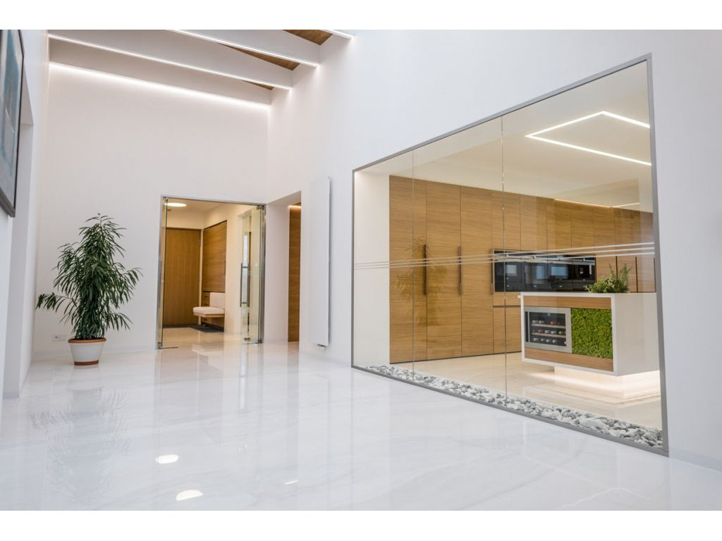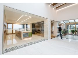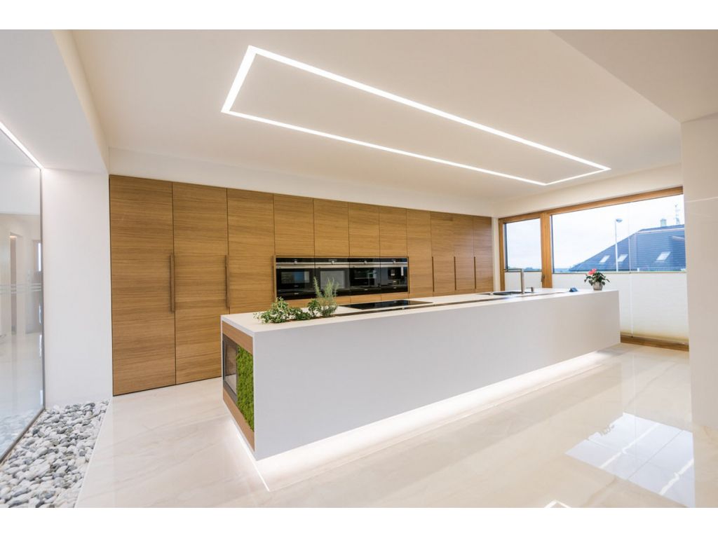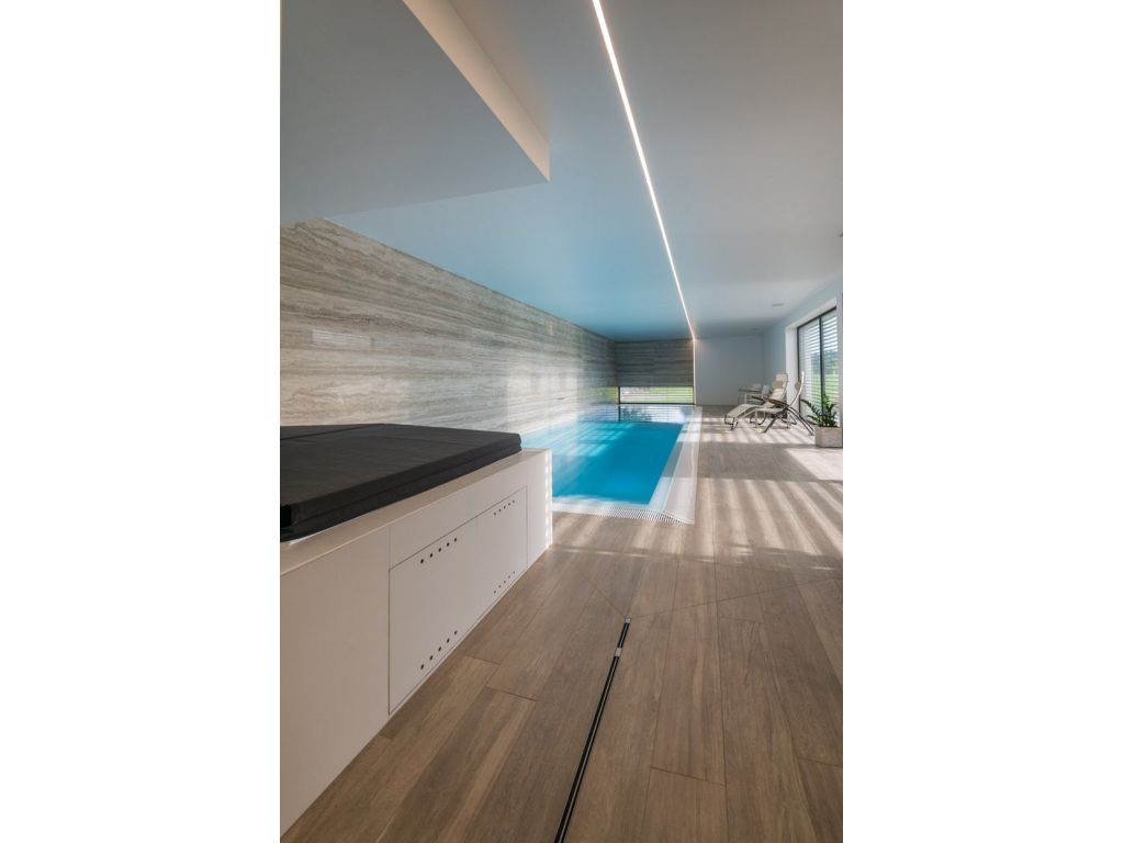 Obklady a dlažby Onice Oro a Onice Perla v rozměru 150x300 cm jsou použity v kuchyni a chodbách. MaxFine Travertino 150x300 cm v kombinaci se Selection Oak 20x120 cm zdobí designovou koupelnu a bazén. Dlažba Selection Oak v designu dřeva splňuje požadavek na protiskluznost v prostorech bazénu se zachováním výjimečného povrchu dřeva.