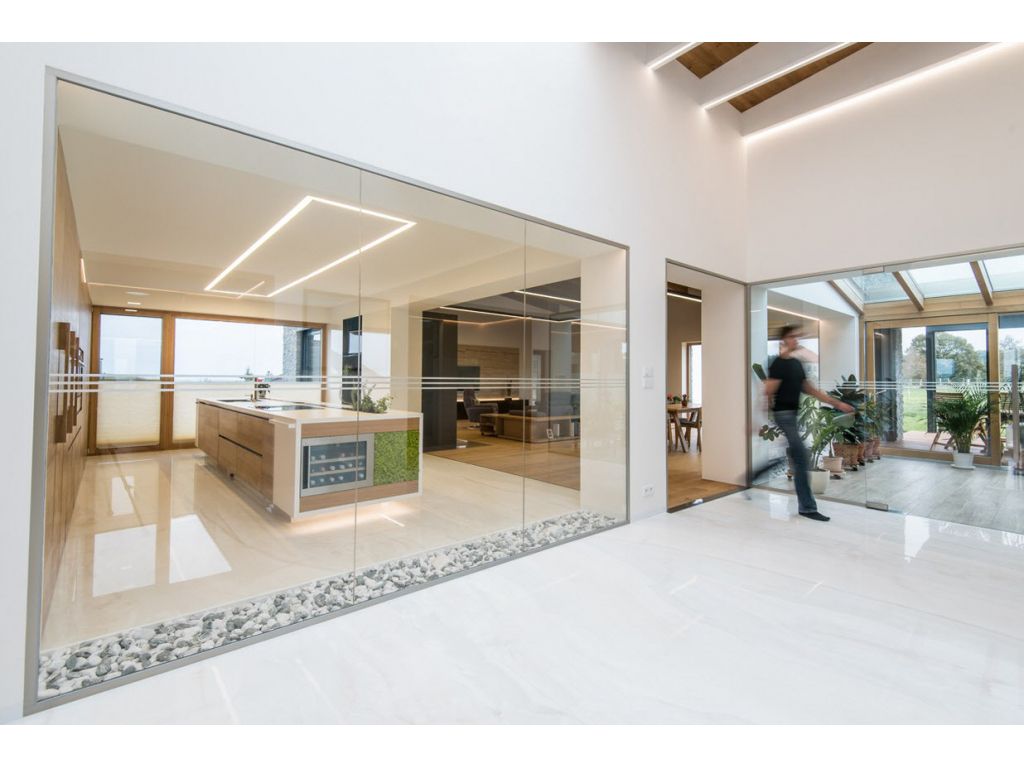 Dům v srdci Hané je moderní, minimalistický a plně funkční. Dominantním prostorem interiéru je prostorná hala, z níž se paprskovitě rozbíhají jednotlivé části domu. V interiéru byly použity jemné přírodní barvy a materiály, které navzájem propojuje dubové dřevo (dlažba) s bílou barvou, travertinem a přírodním lišejníkem.